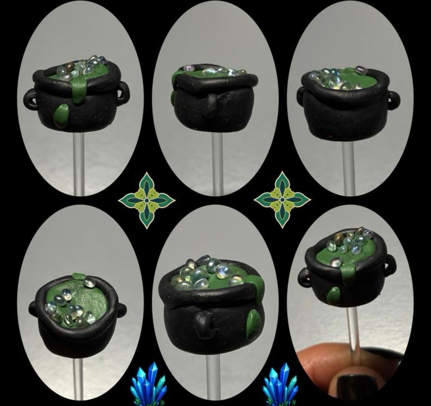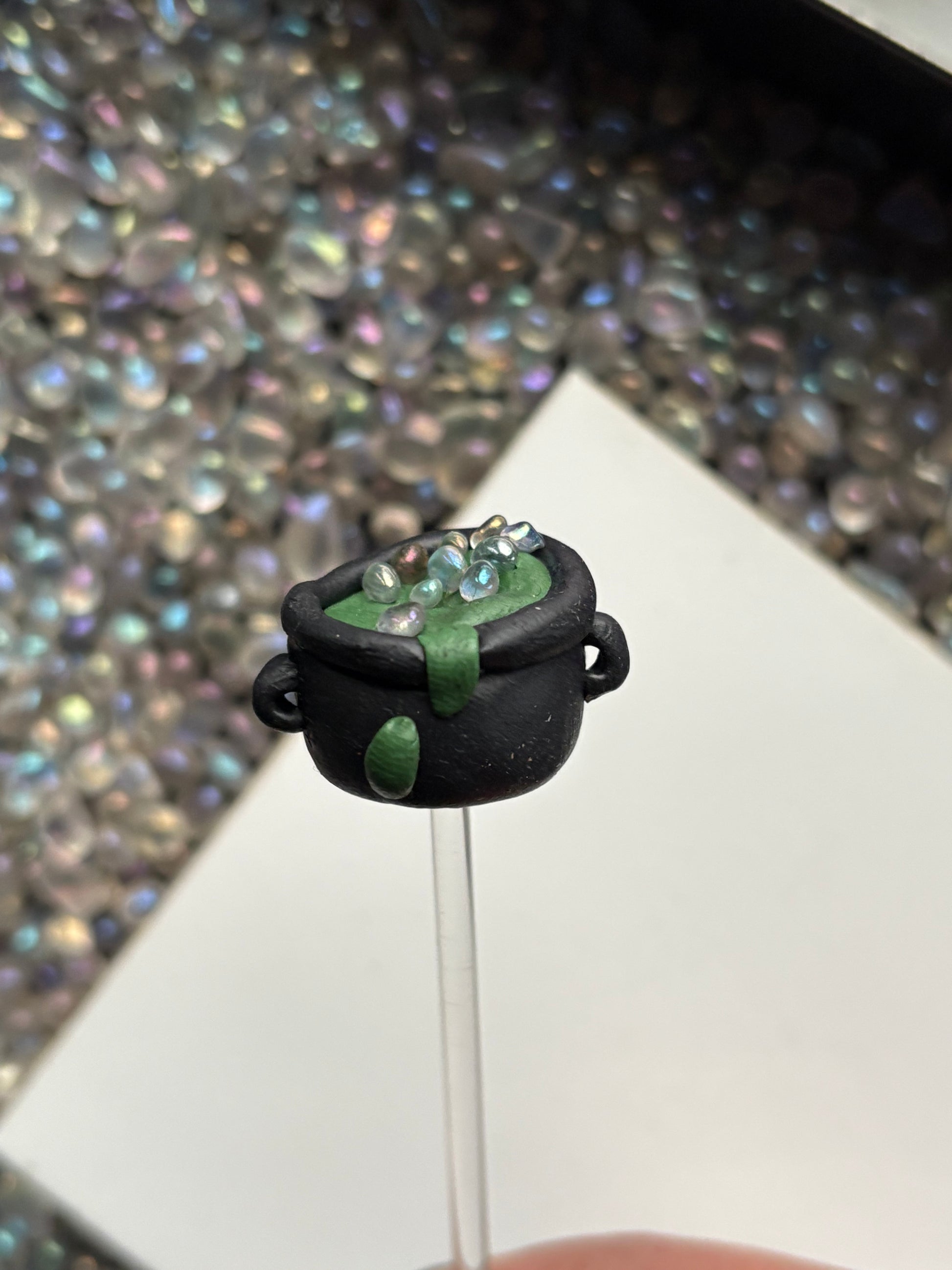 This handcrafted clay cauldron is filled with a green potion and topped with sparkling aura quartz bubbles.