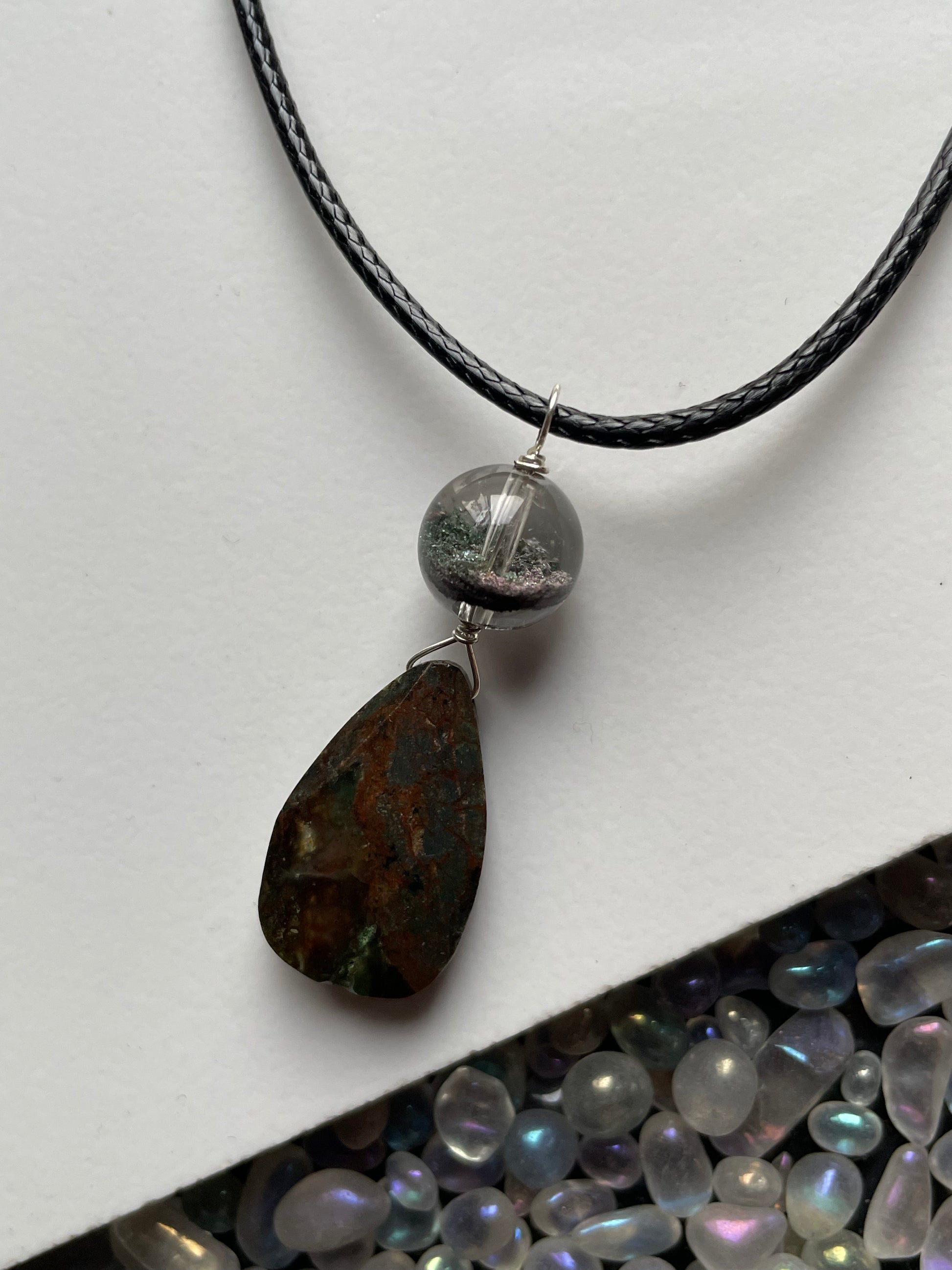 Bicoloured brown with hints of green Chrysoprase (certified) - faceted teardrop & 8mm rainbow filled Garden Quartz bead