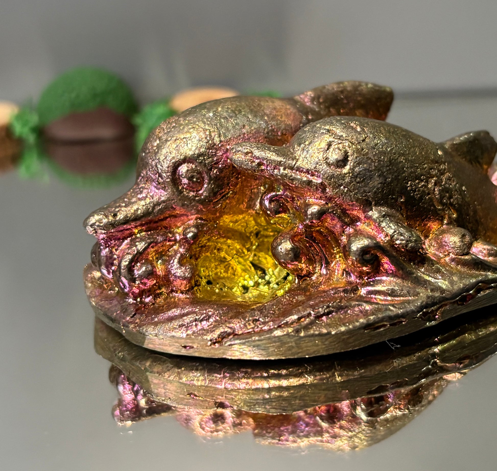 Stunning sculpture gold pink coloured Dolphin pair splashing in the ocean waves made out of Bismuth