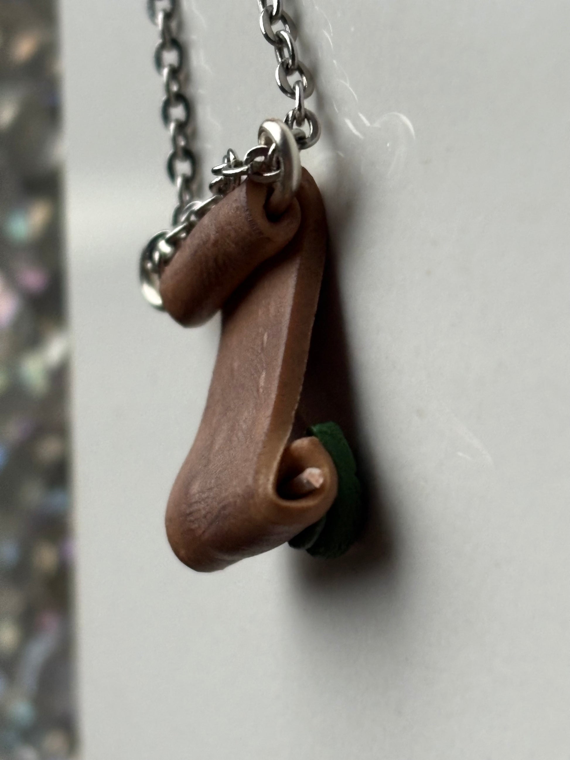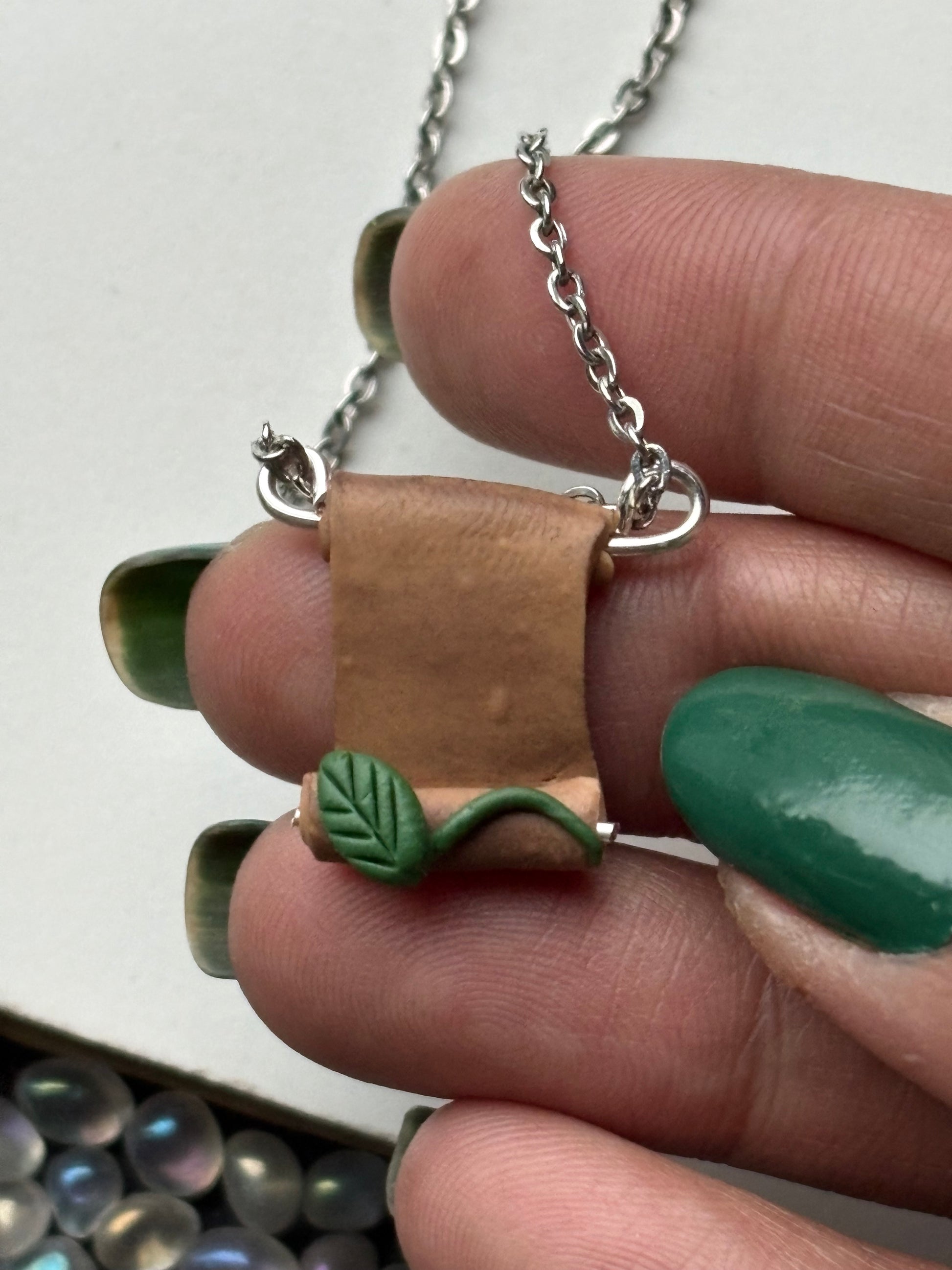 Inspired by the intrigue and elegance of Bridgerton and the mysterious writings of Lady Whistledown. This leafy scroll necklace captures the charm of secrets whispered throughout the Ton. The delicate scroll is crafted with clay, adorned with a green vine and leaf, symbolising hidden stories and quiet observation.
