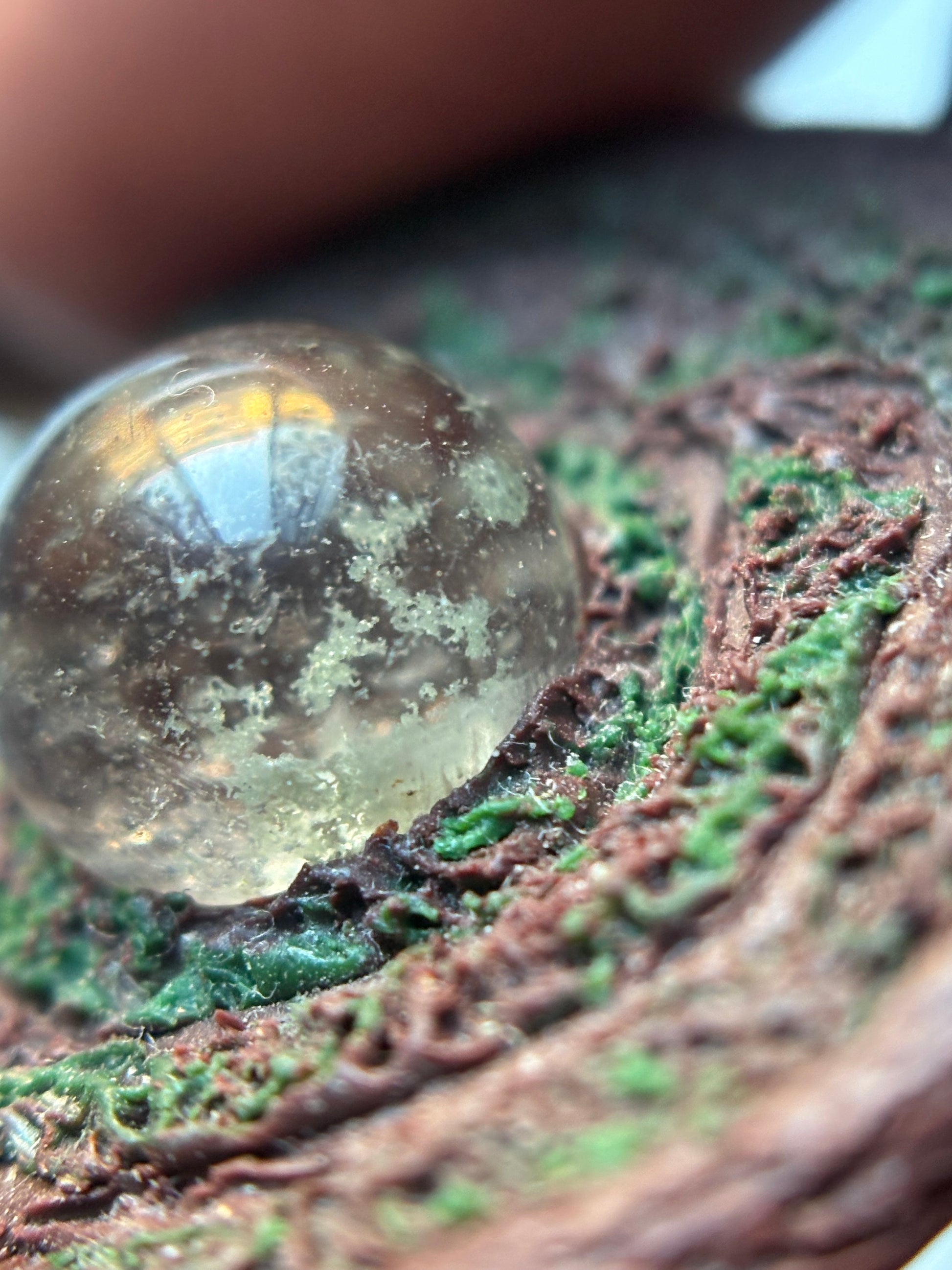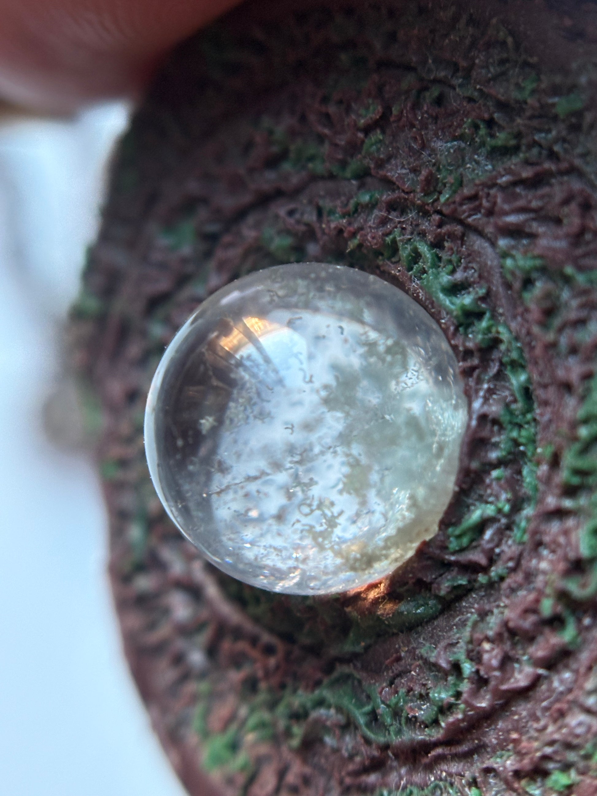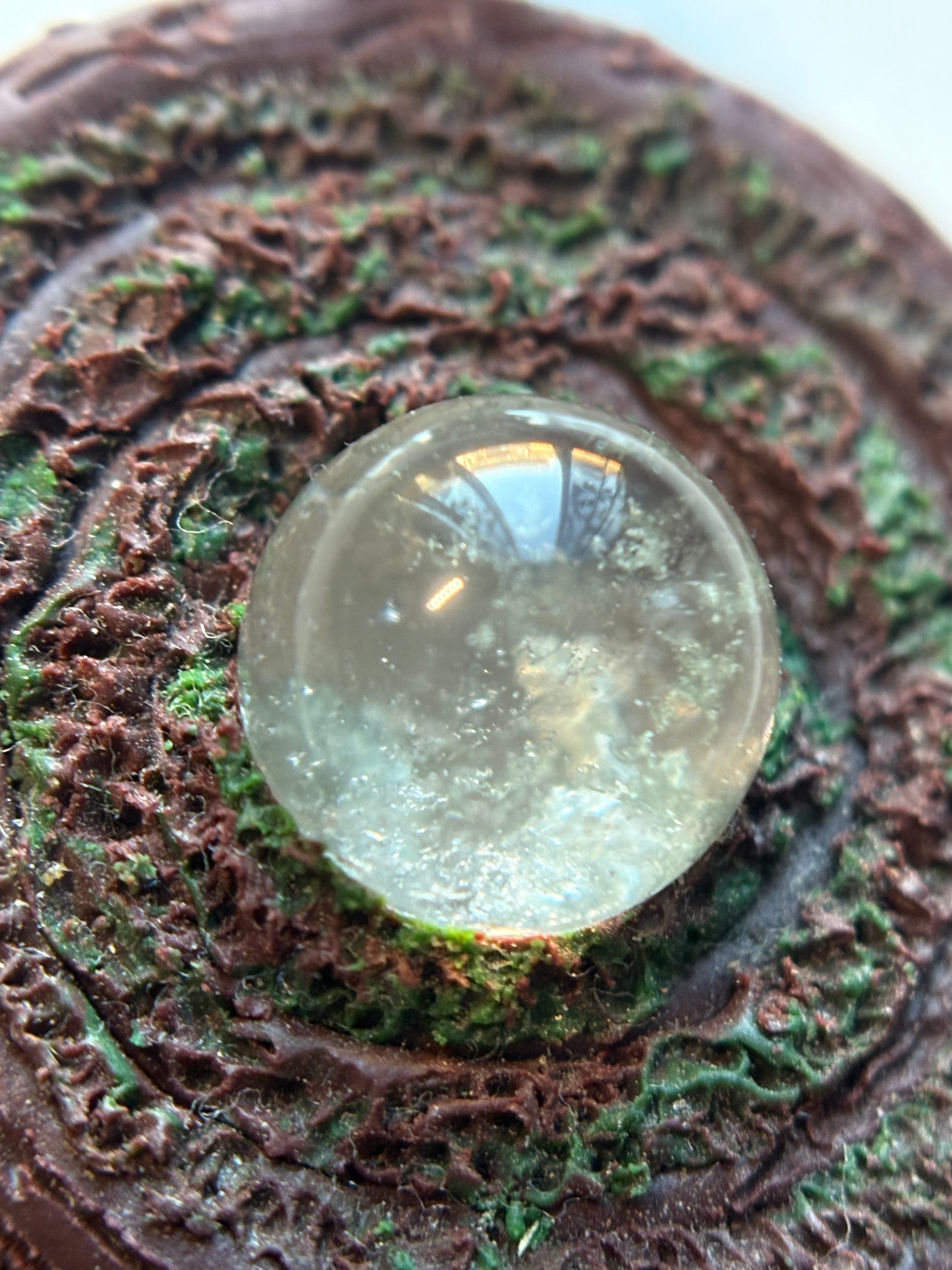 Lodalite aka Garden Quartz mossy looking mini sphere 10mm in the centre of a wooden mossy effect swirl made with clay for a lightweight feel
