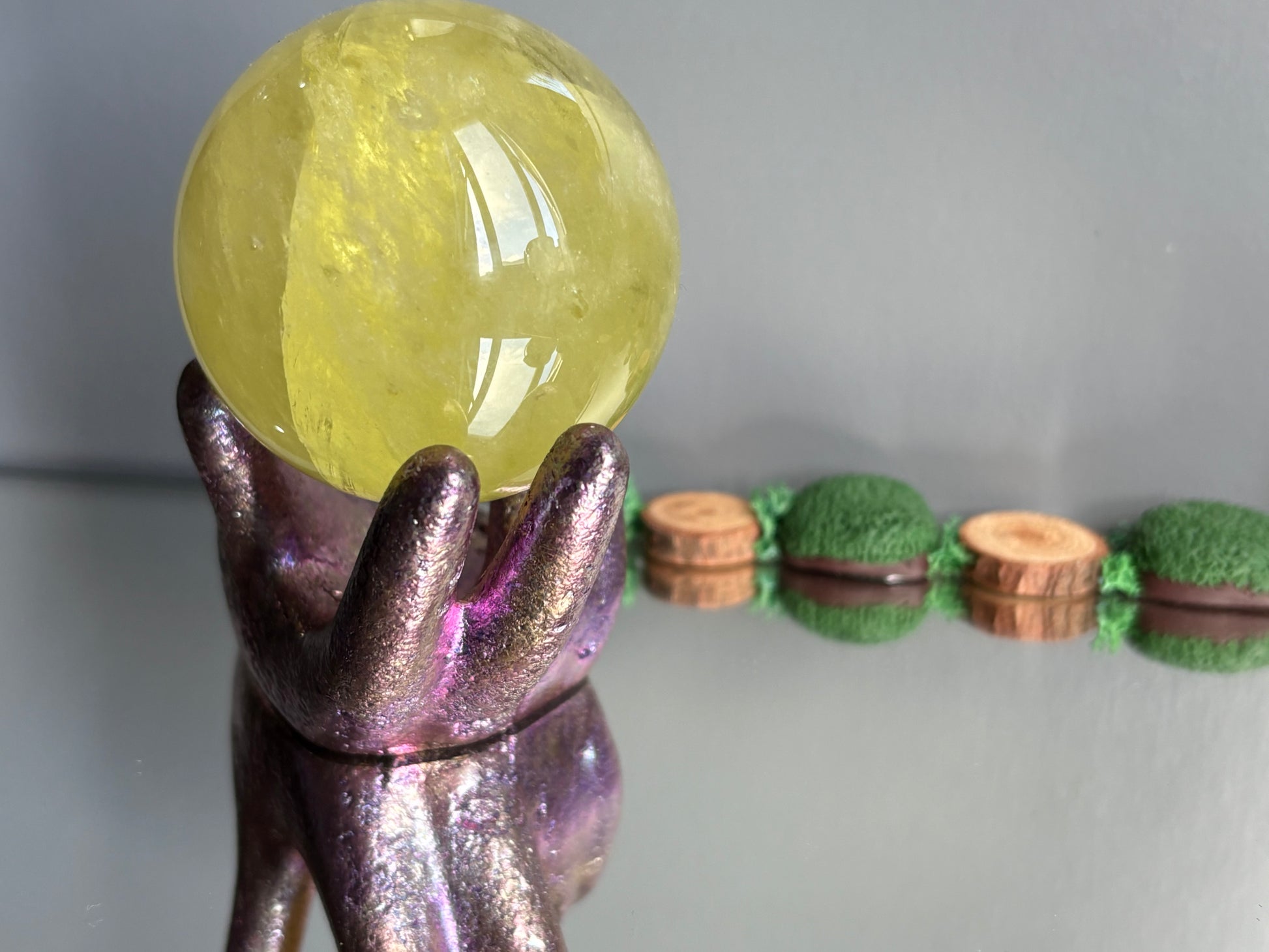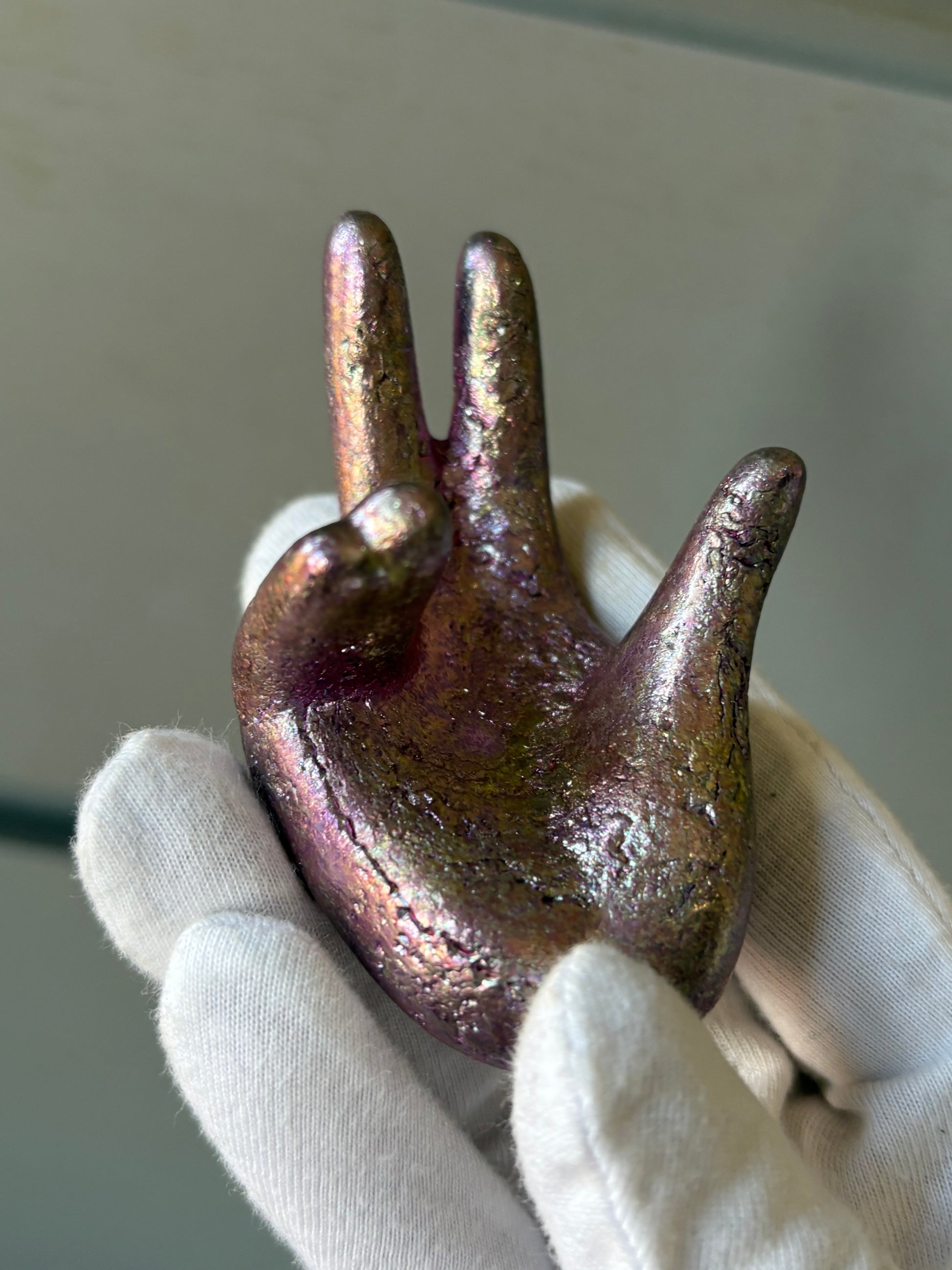 Stunning hand sphere holder sculpture made out of pink coloured bismuth
