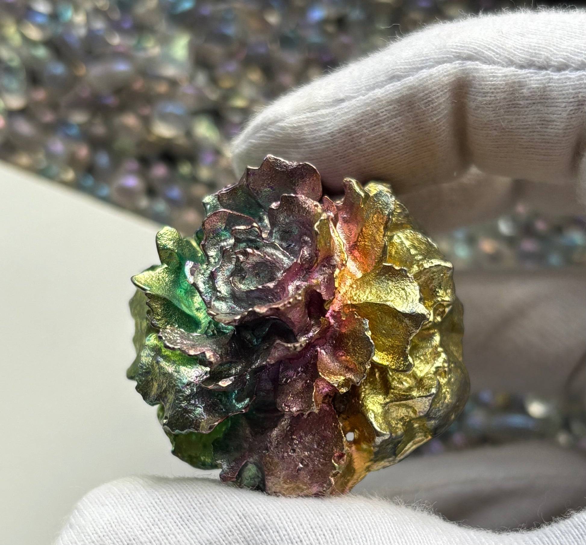 Sublimely detailed rainbow coloured Bismuth Rose Flower carving