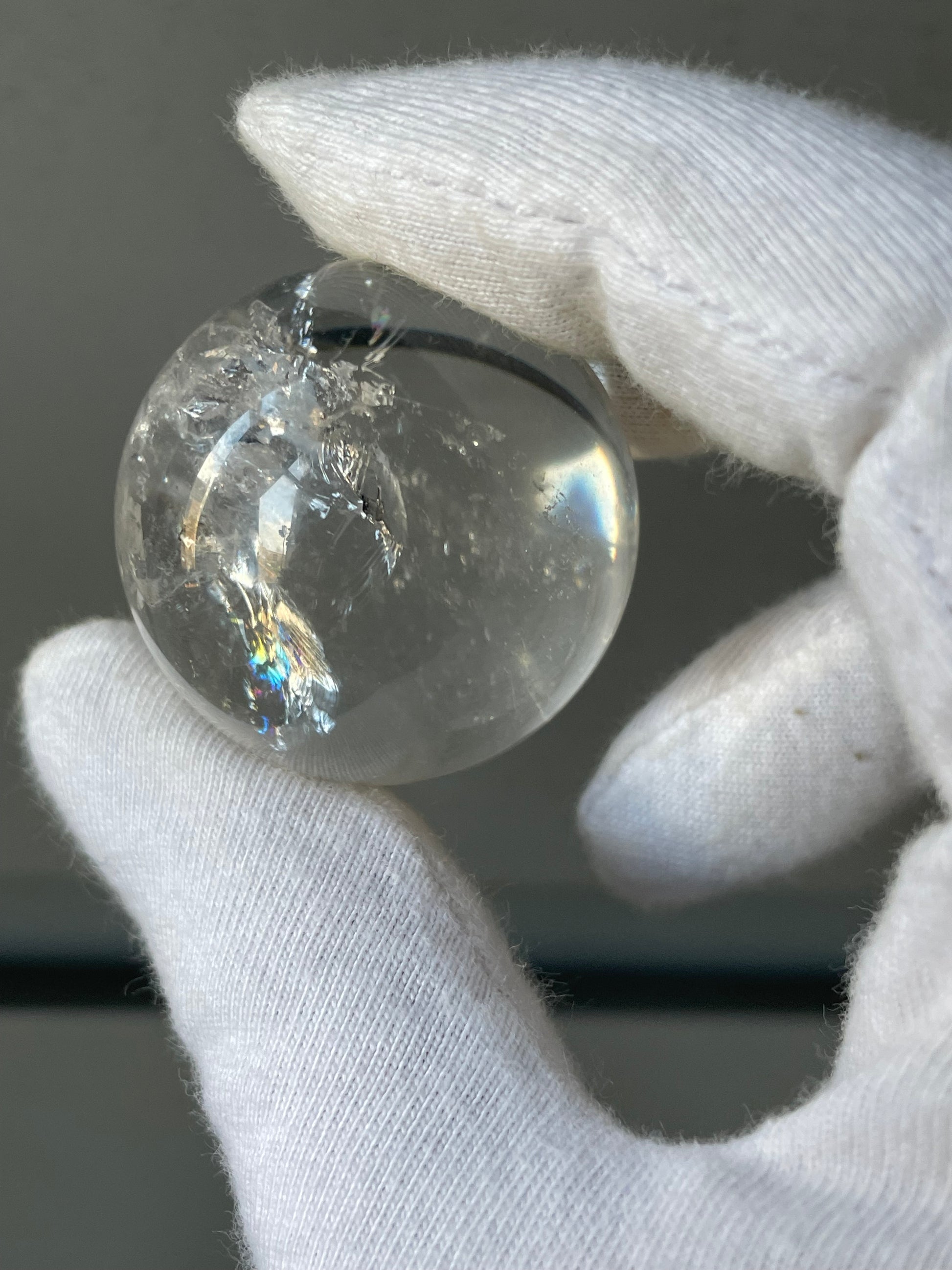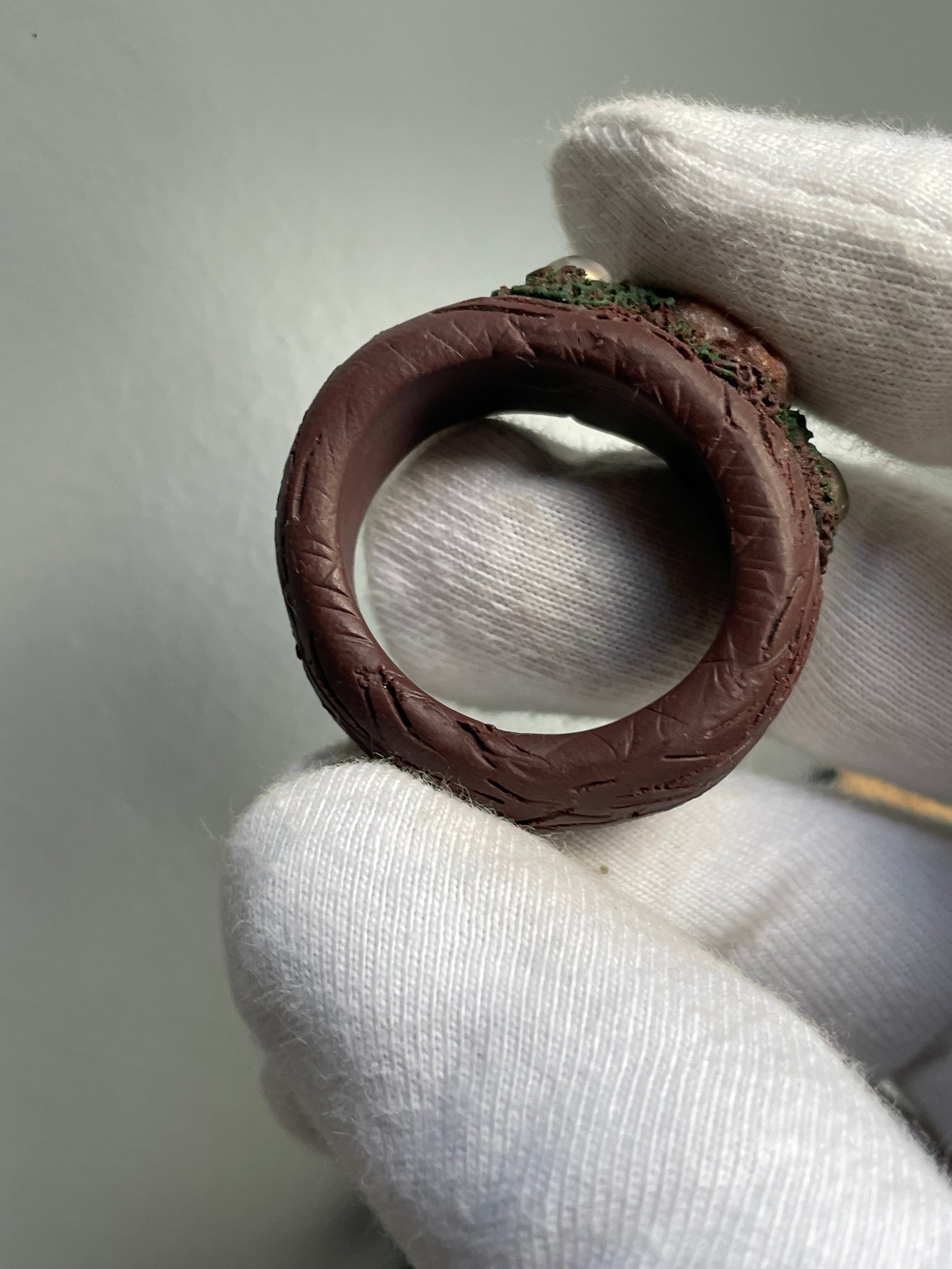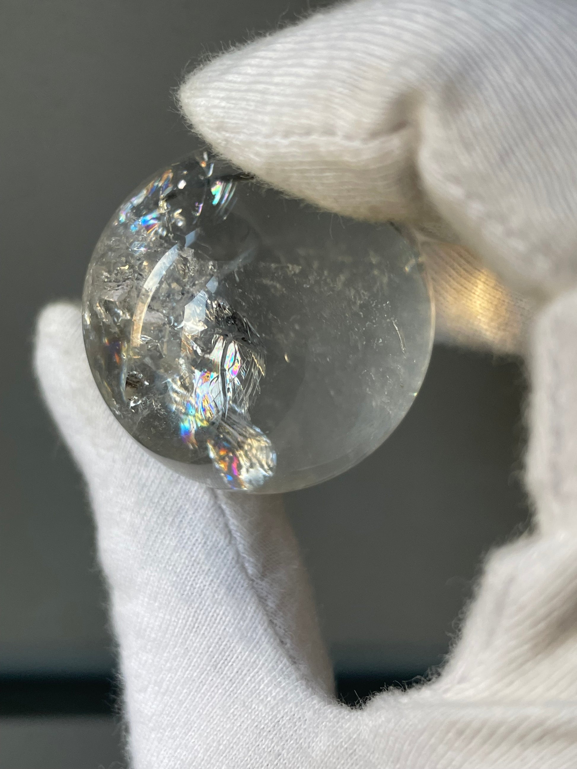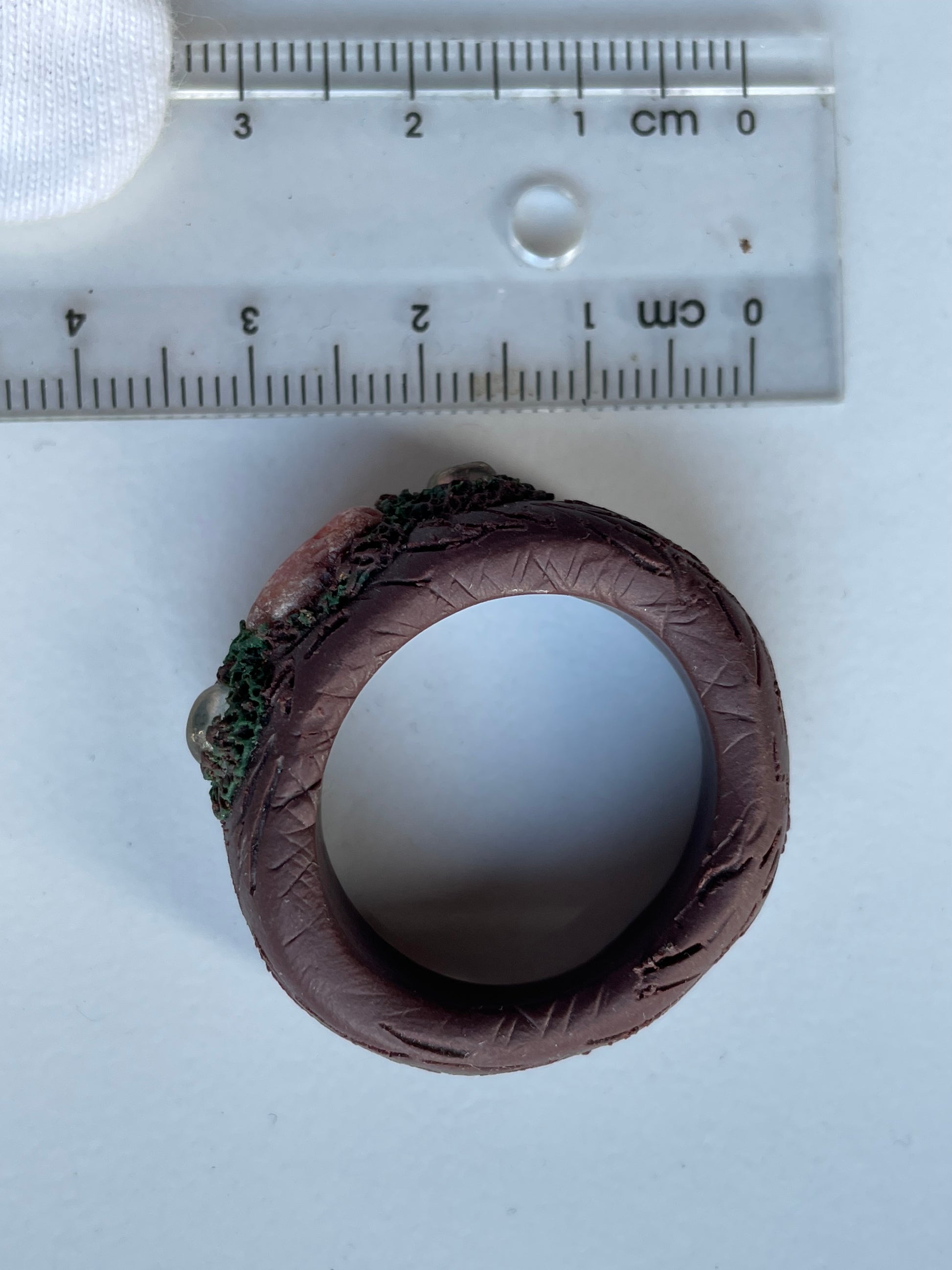 Clear quartz rainbow filled sphere with Ruby & Aura Quartz set into an enchanted forest sphere ring holder can also be used as a ring if you’re feeling like a forest fairy!
