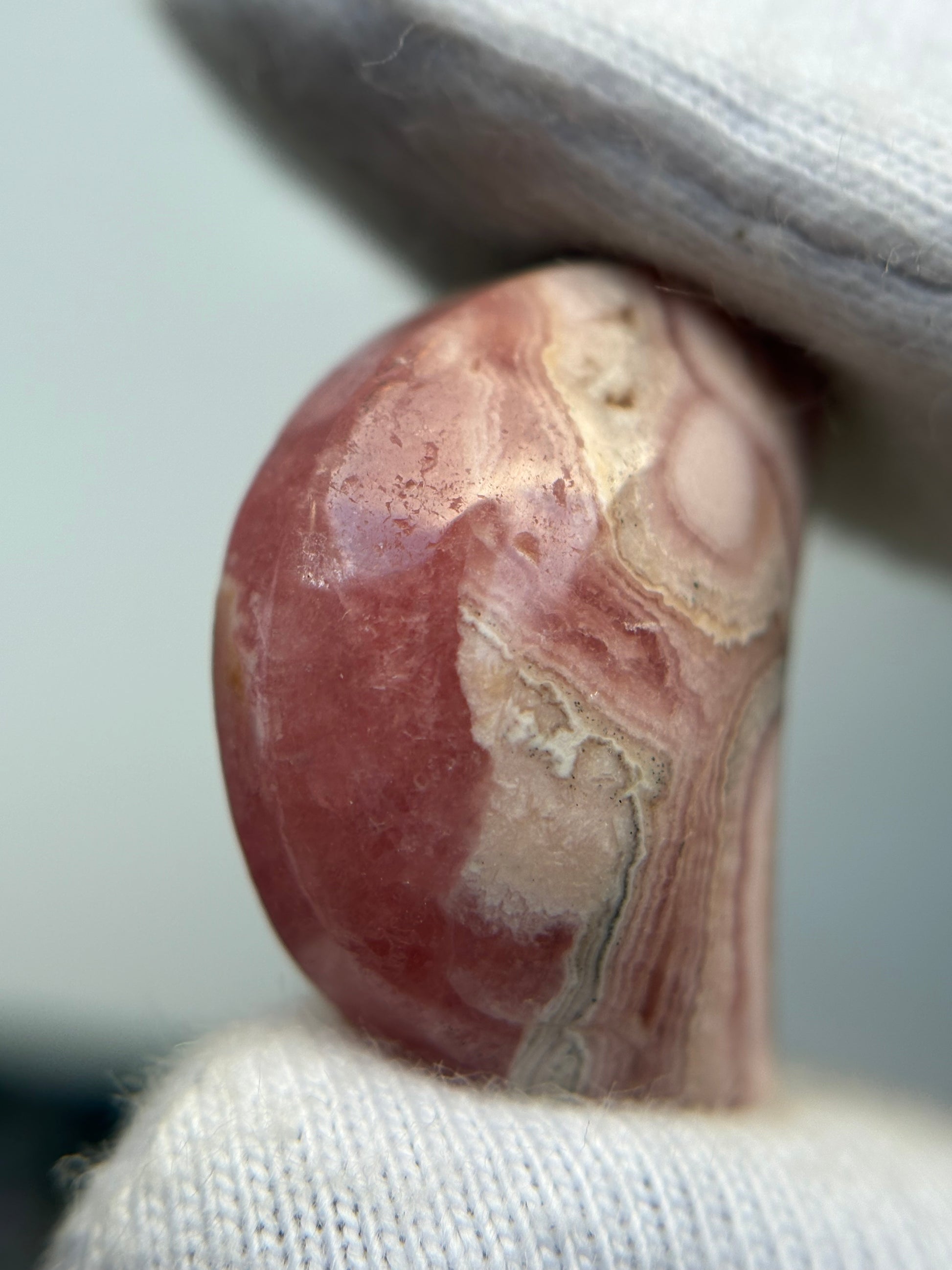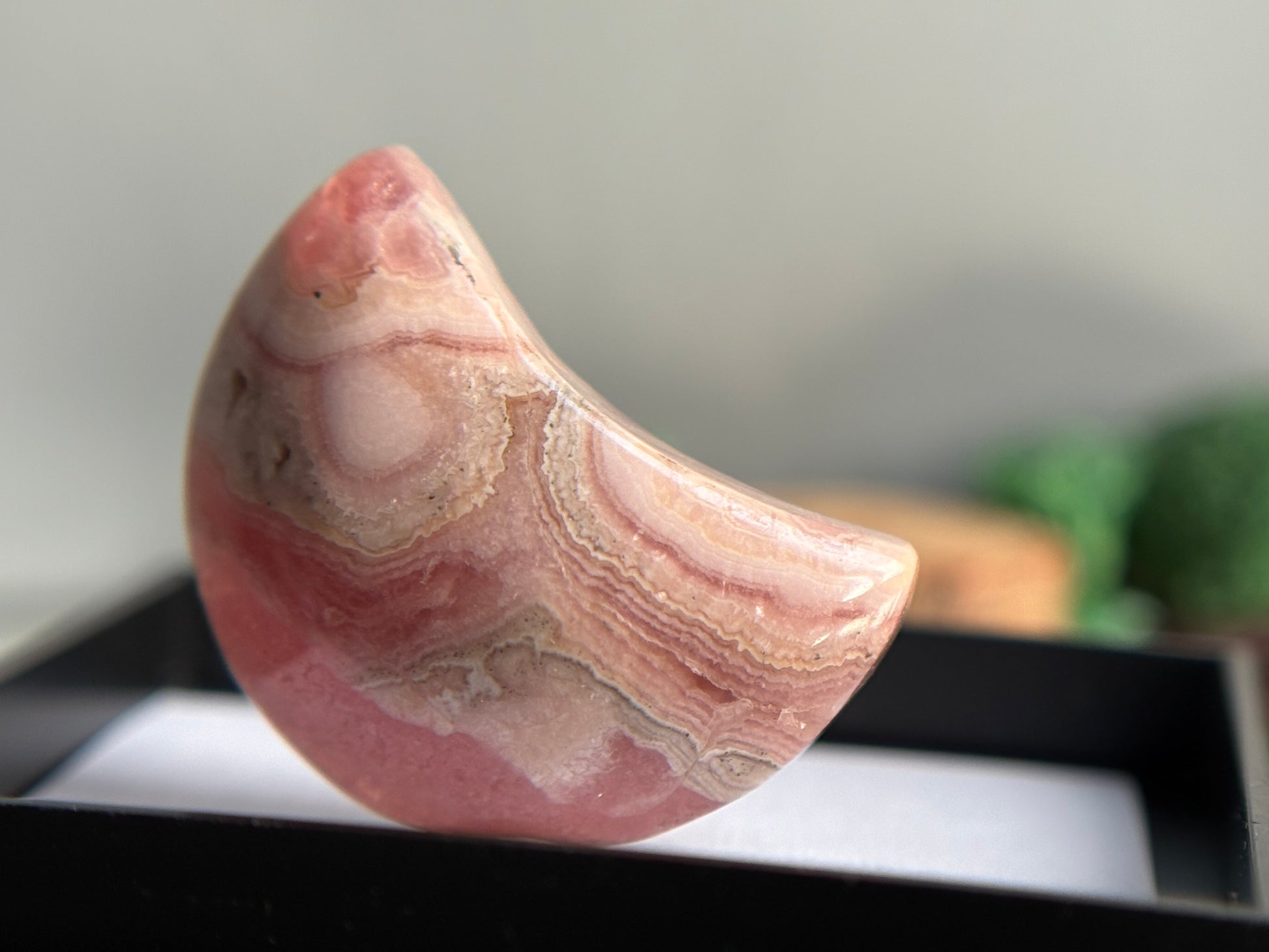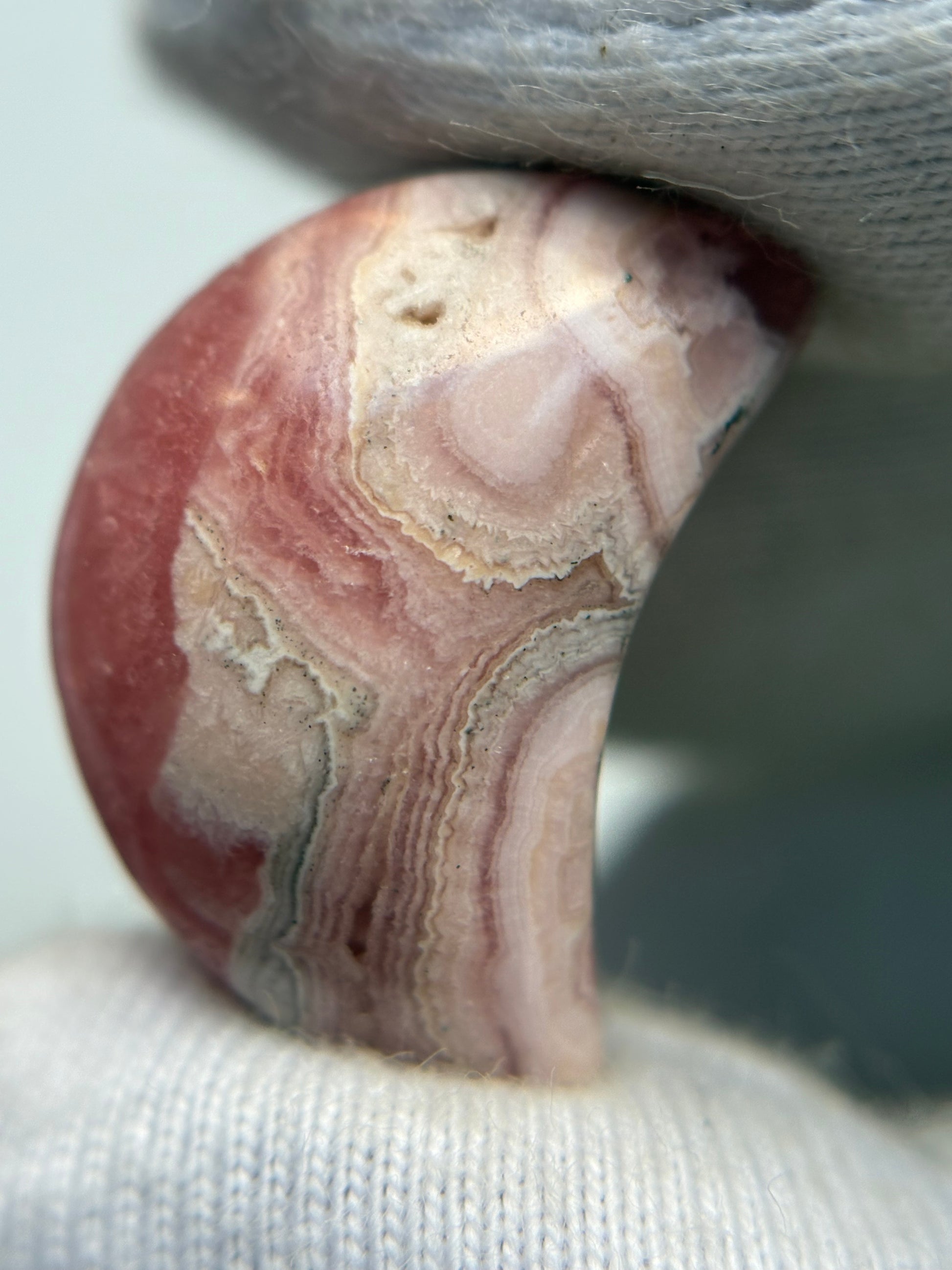 Hand carved flat backed crescent moon Rhodochrosite gemstone crystal (Argentina)
