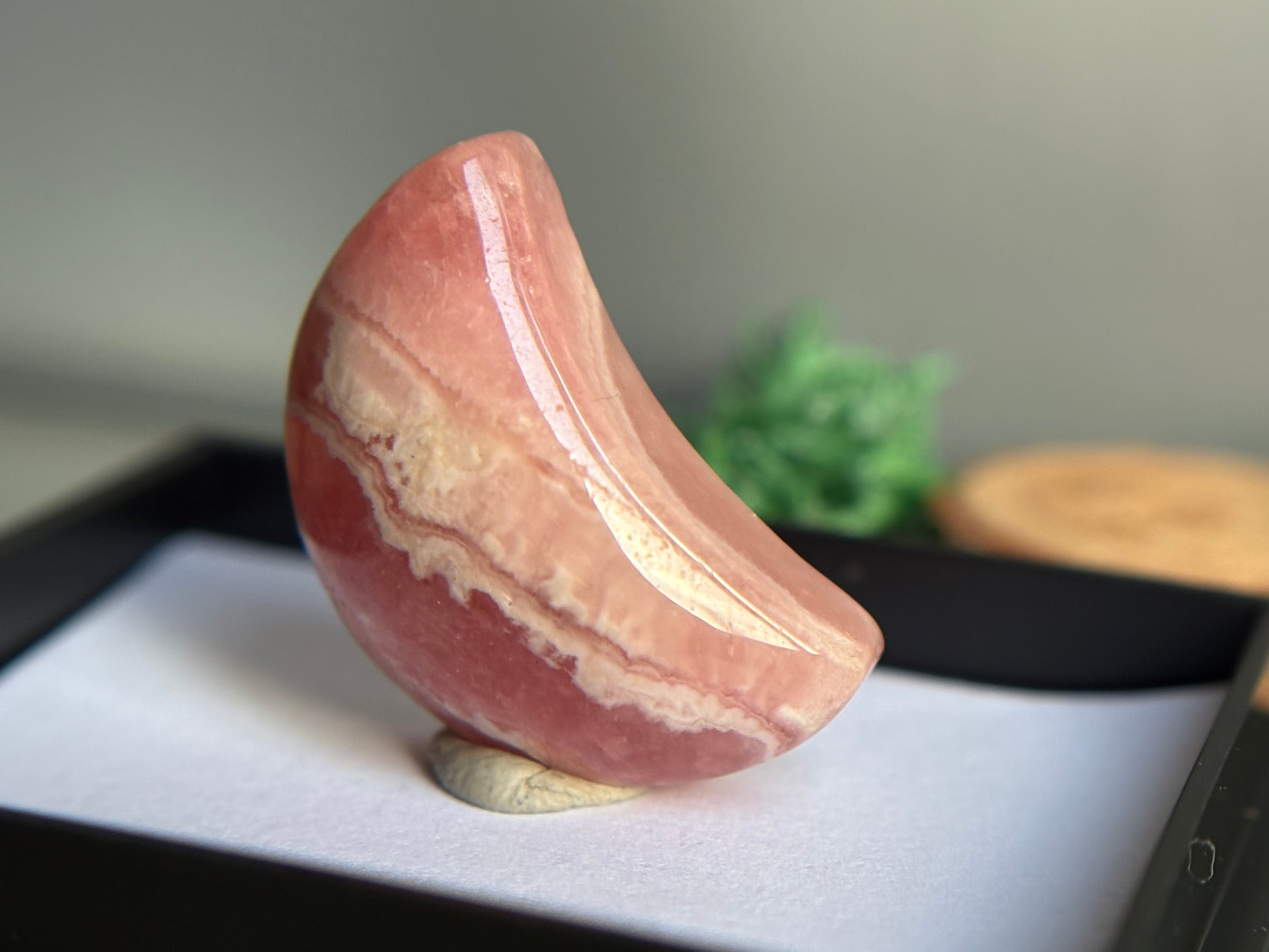 Hand carved flat backed crescent moon Rhodochrosite gemstone crystal (Argentina)