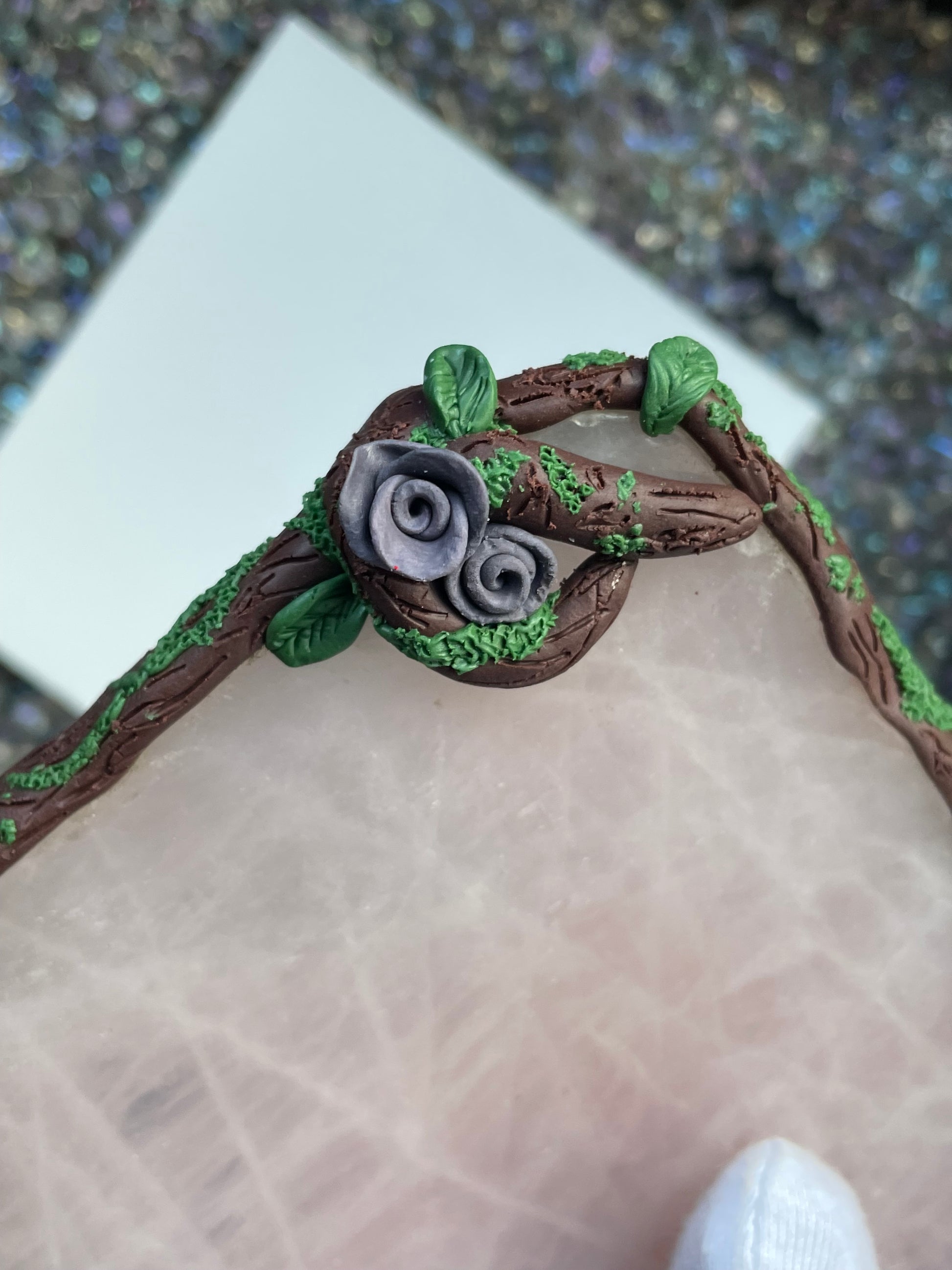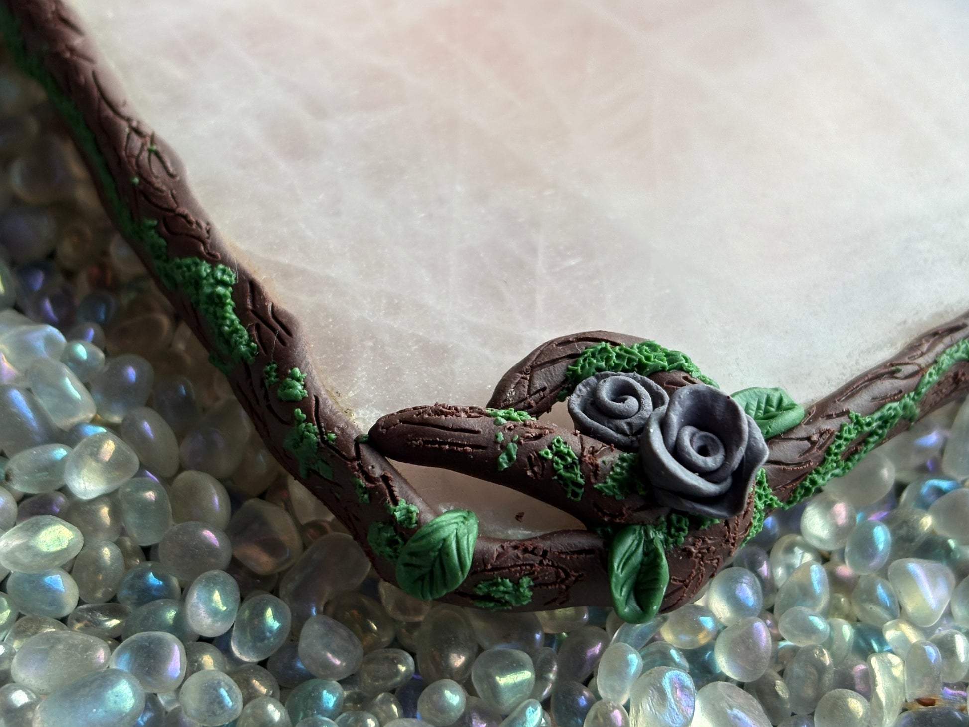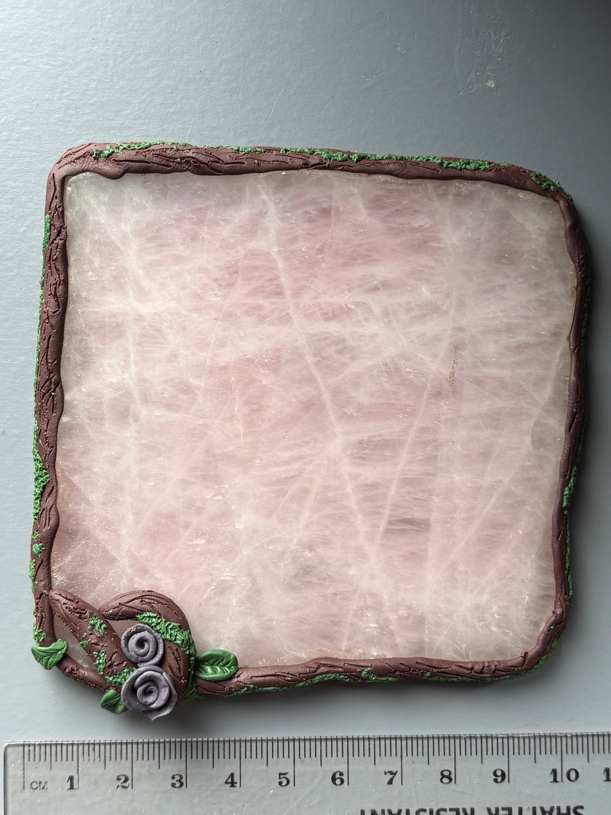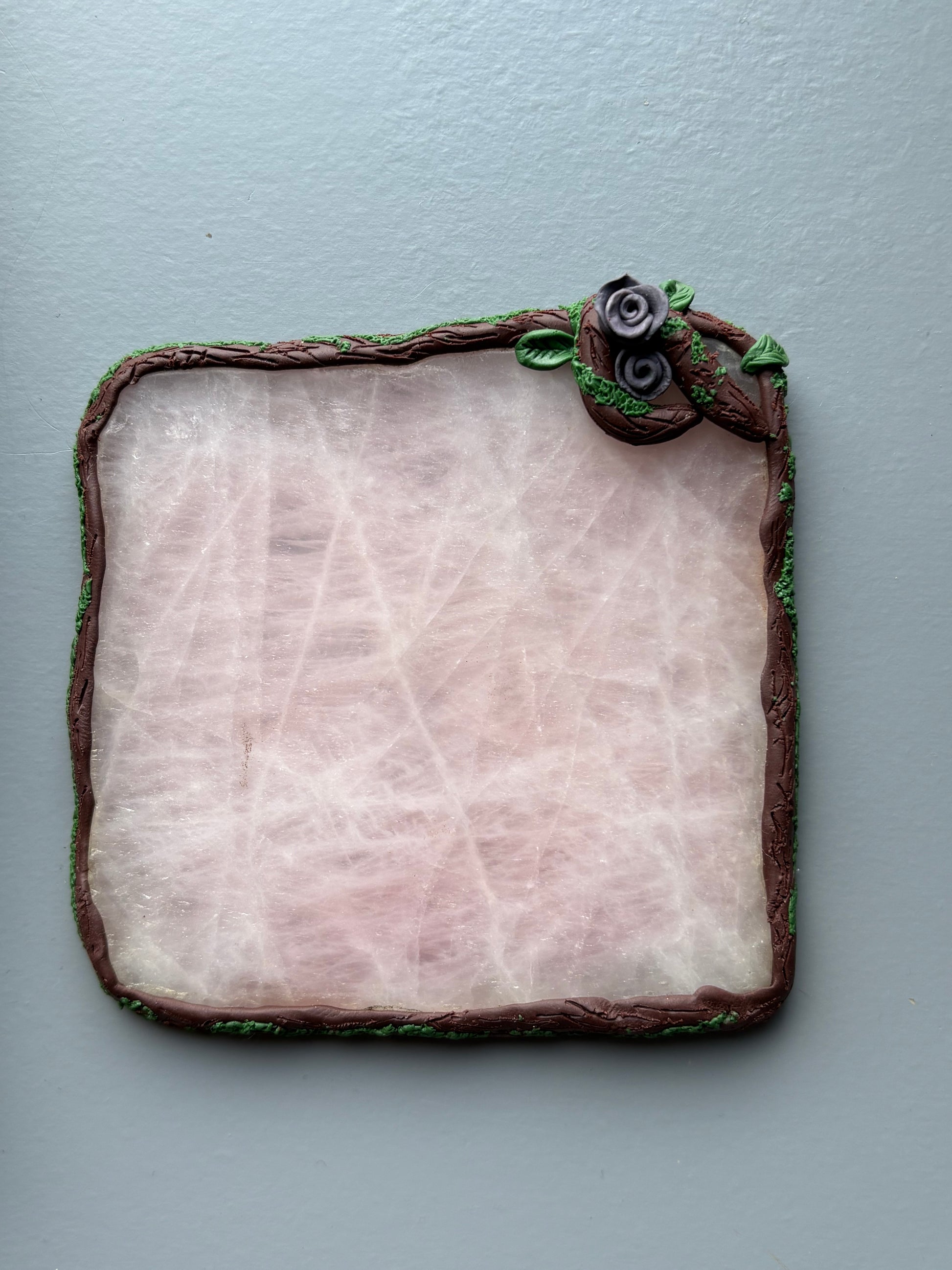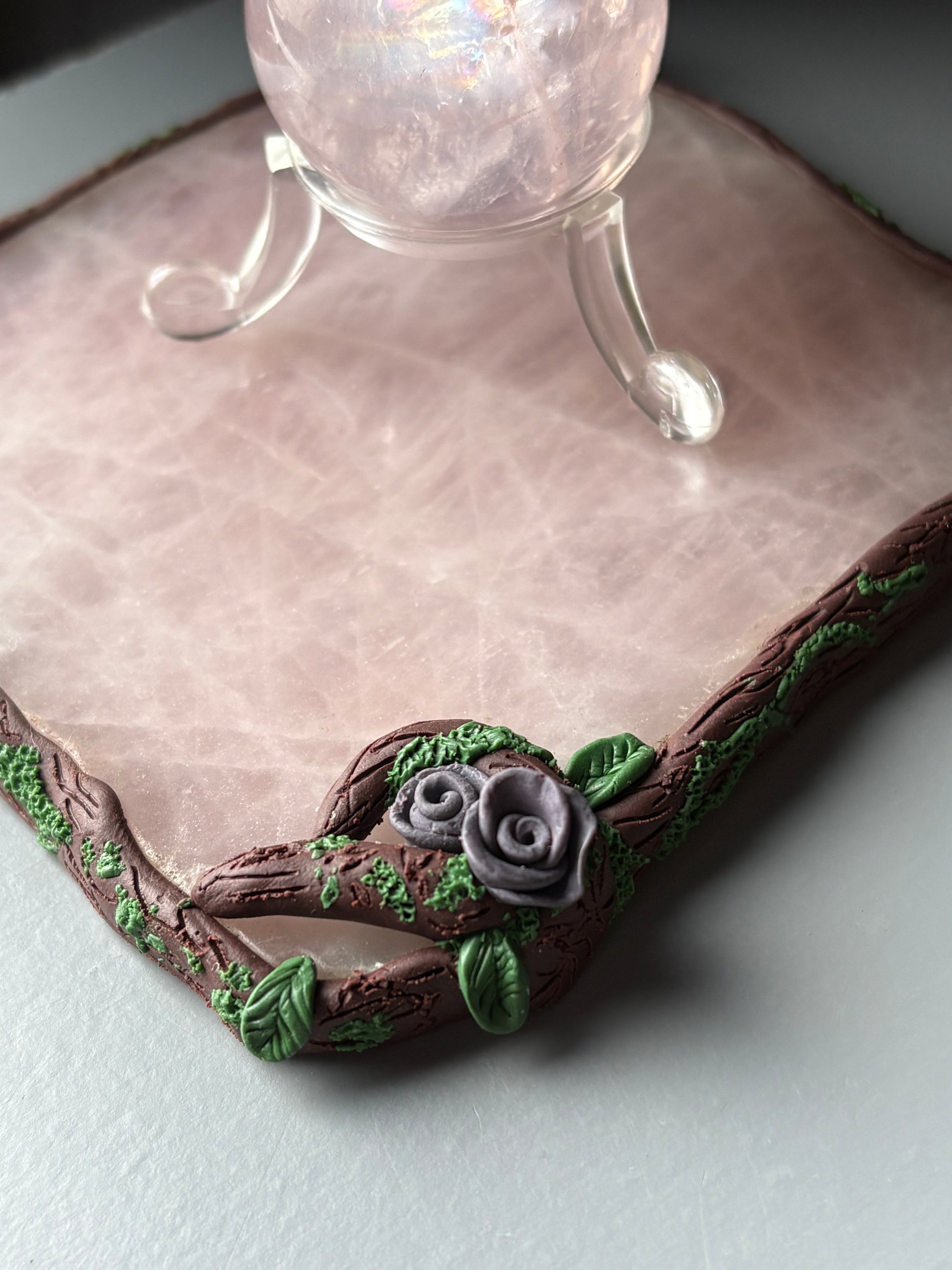Framed with delicate, vine like detail and tiny purple roses, the gentle blush of rose quartz evokes the grace, beauty, and whispered secrets of a garden soirée. Both decorative and practical, it protects your surfaces while adding a refined, romantic charm worthy of any afternoon tea or candlelit gathering.