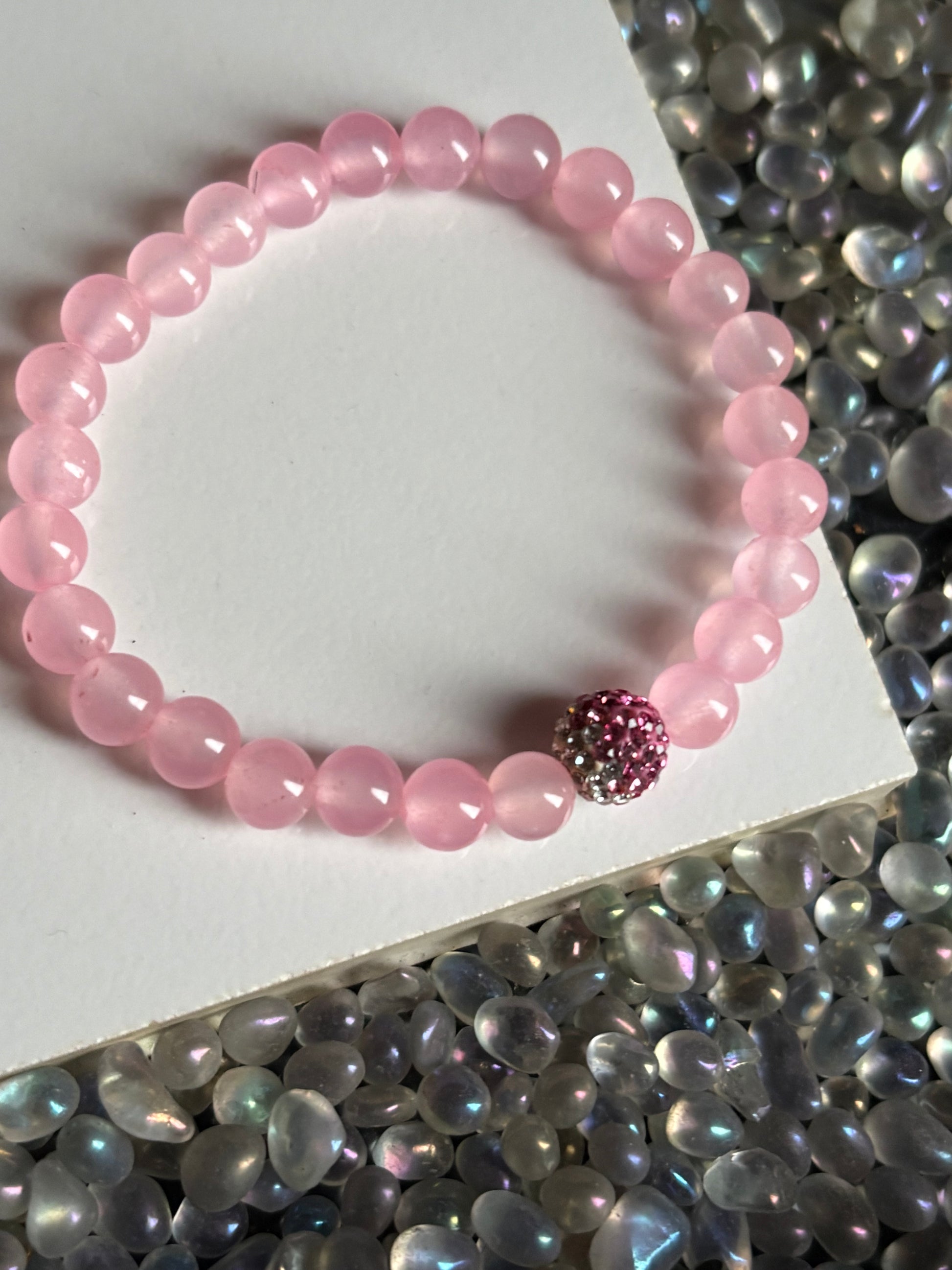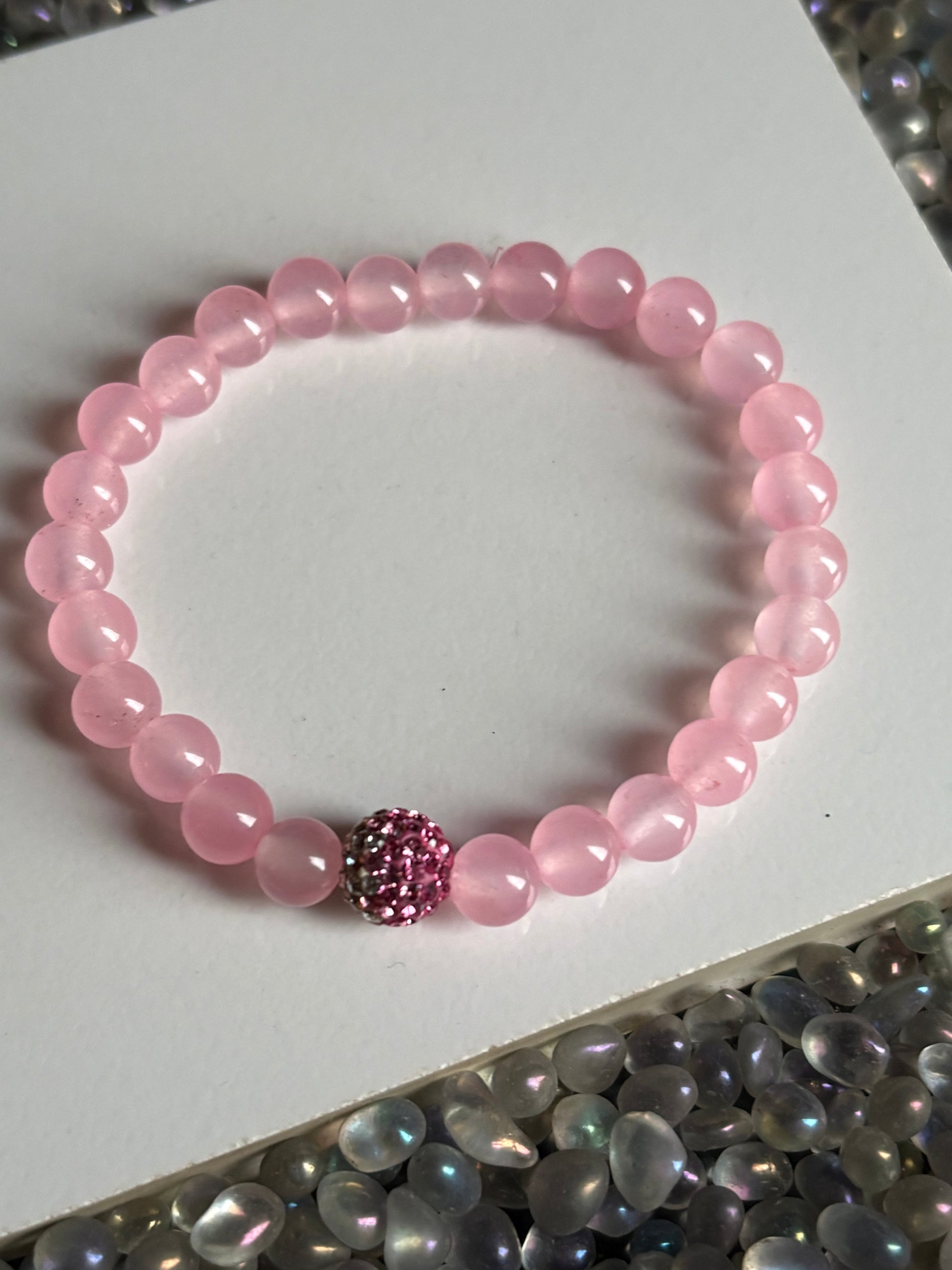 Created with eye catching Rose Quartz 6mm smooth round beads with a simple dazzling hand set pink/white pave clay bead centre