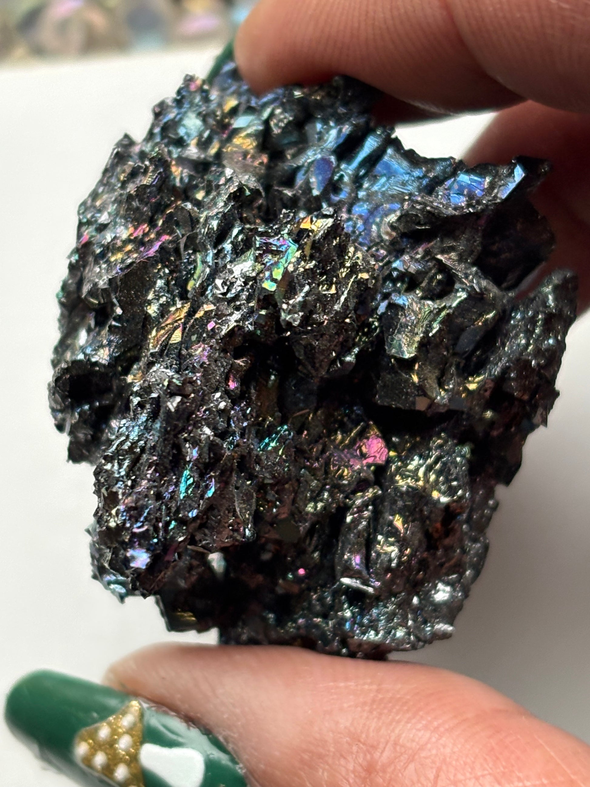 This beautiful crystal features black spiky formations with a vibrant, rainbow-like shine, displaying iridescent hues of green, blue, yellow, pinks and more. The rainbow of Carborundum are believed to correspond to the seven chakras, promoting harmony and balance in the body.