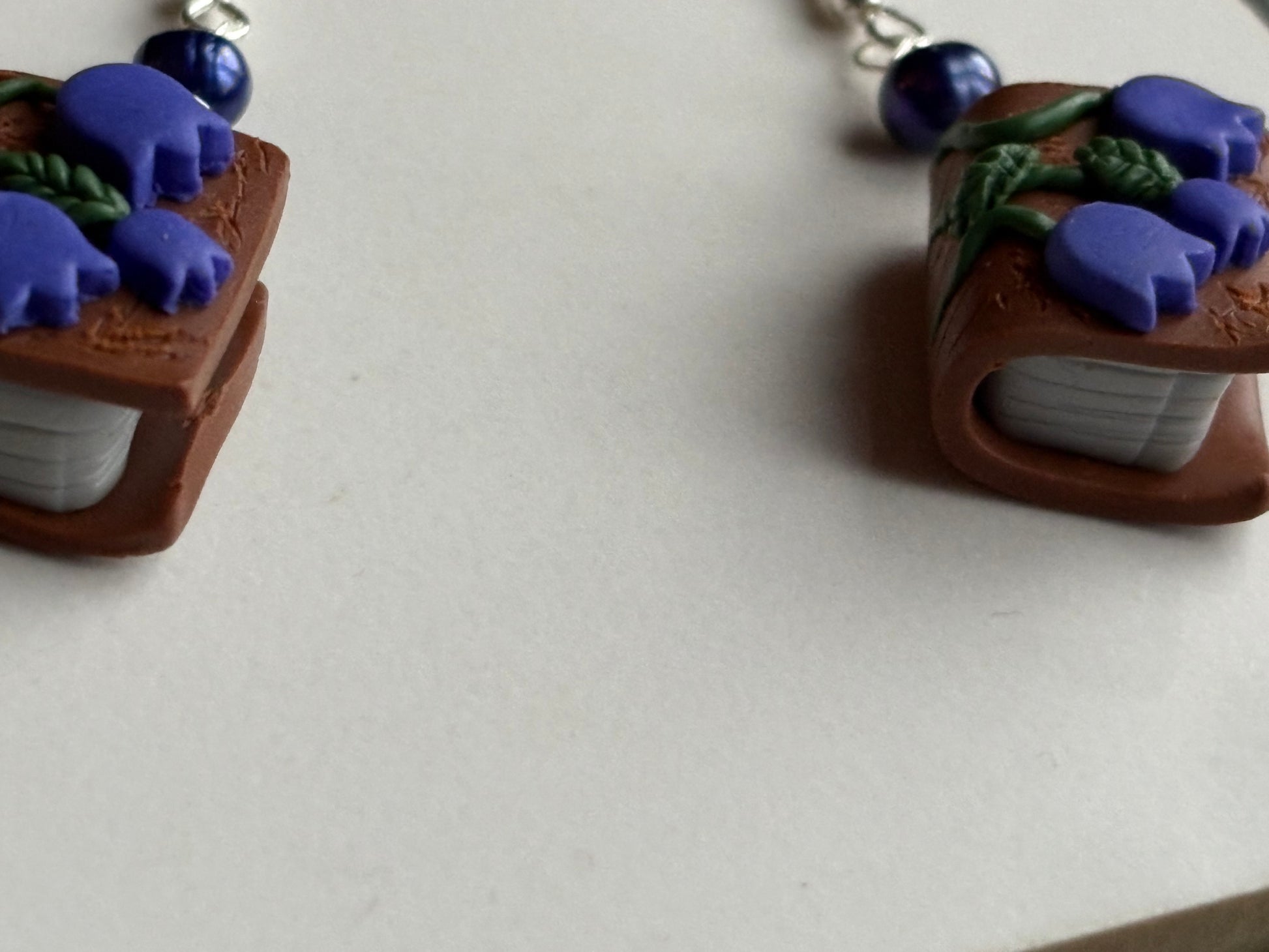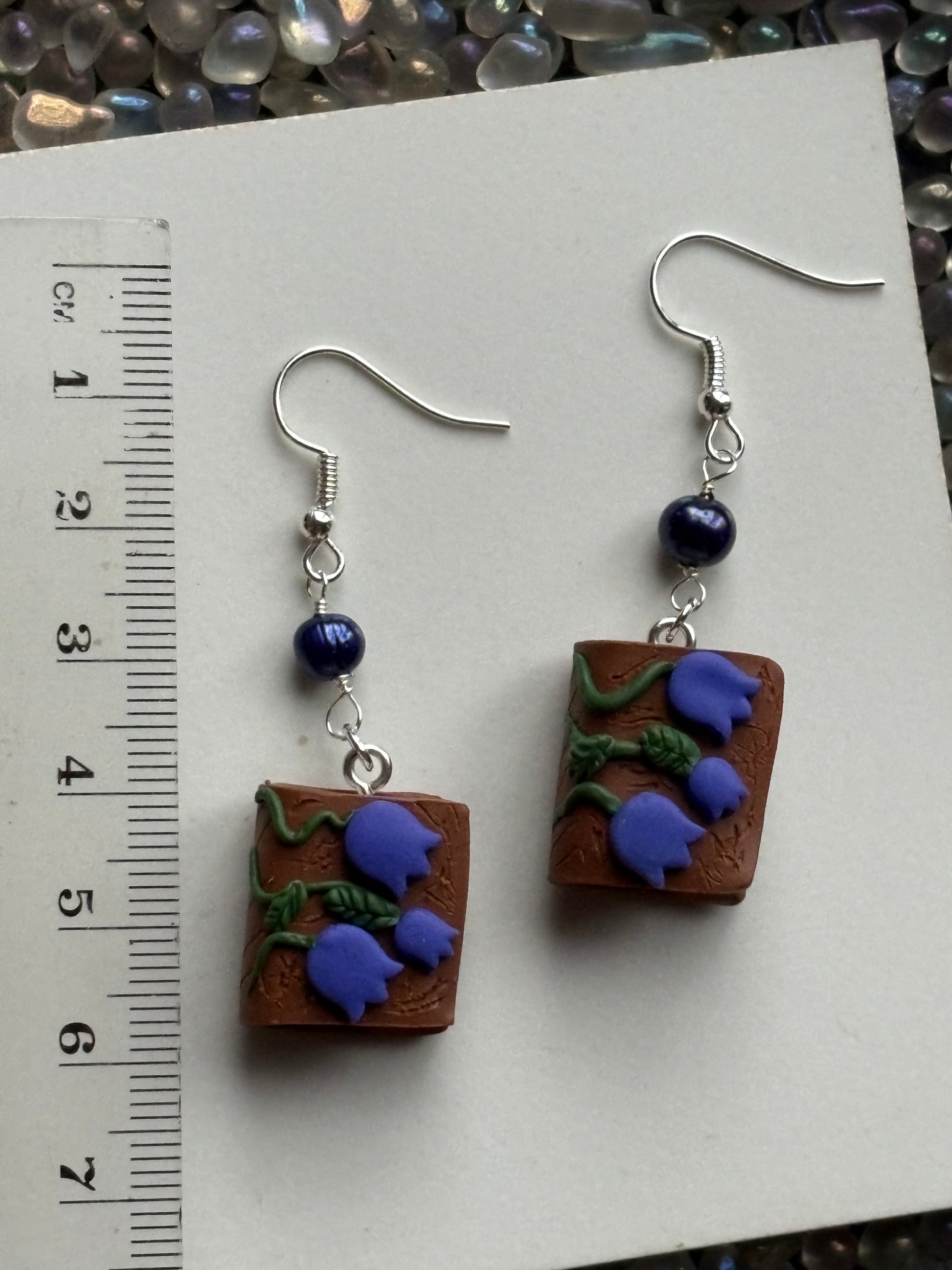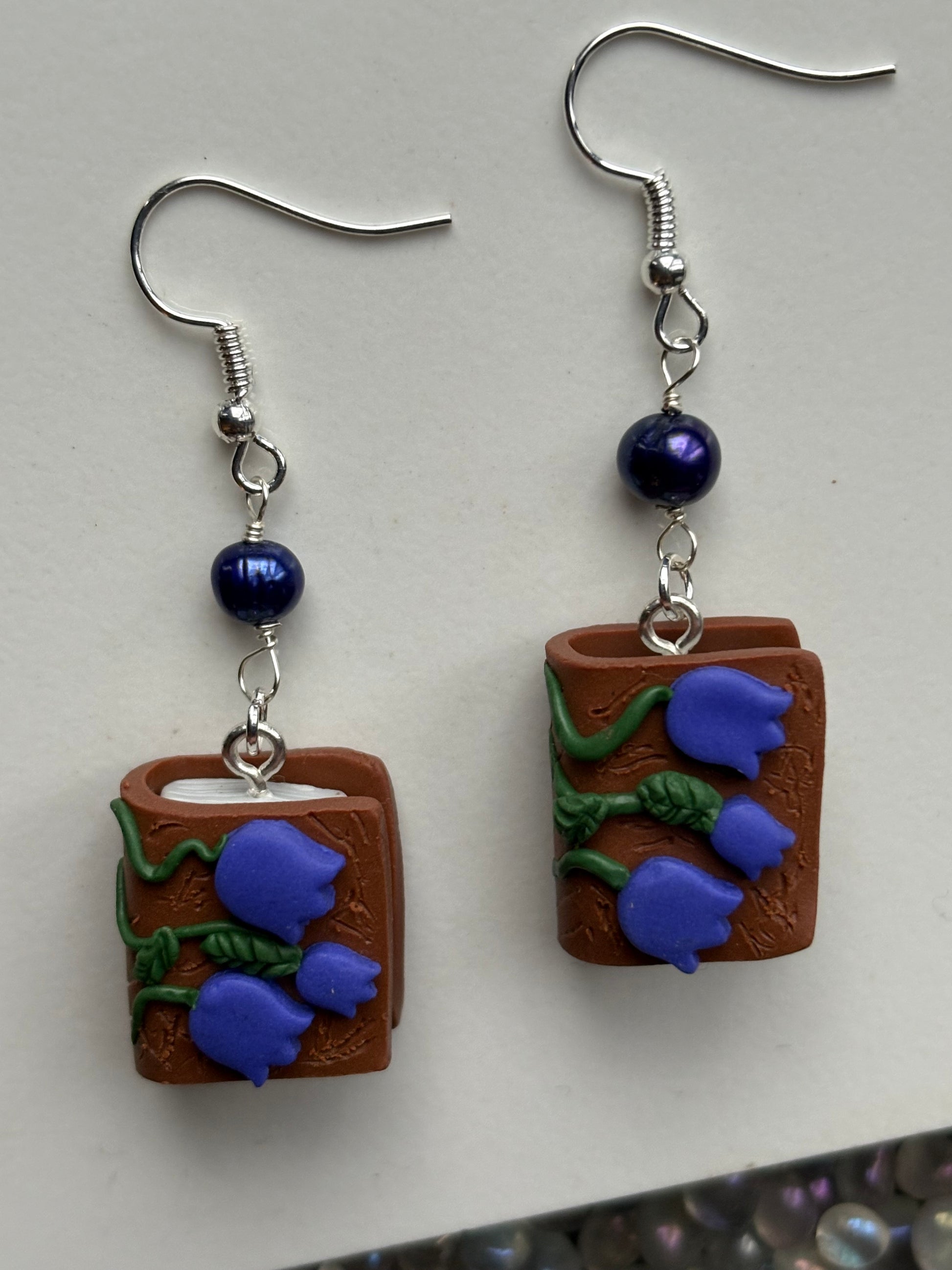 This particular design has a tiny book with a bluebell flower cover with matching coloured Purple Freshwater Cultured Pearl beads