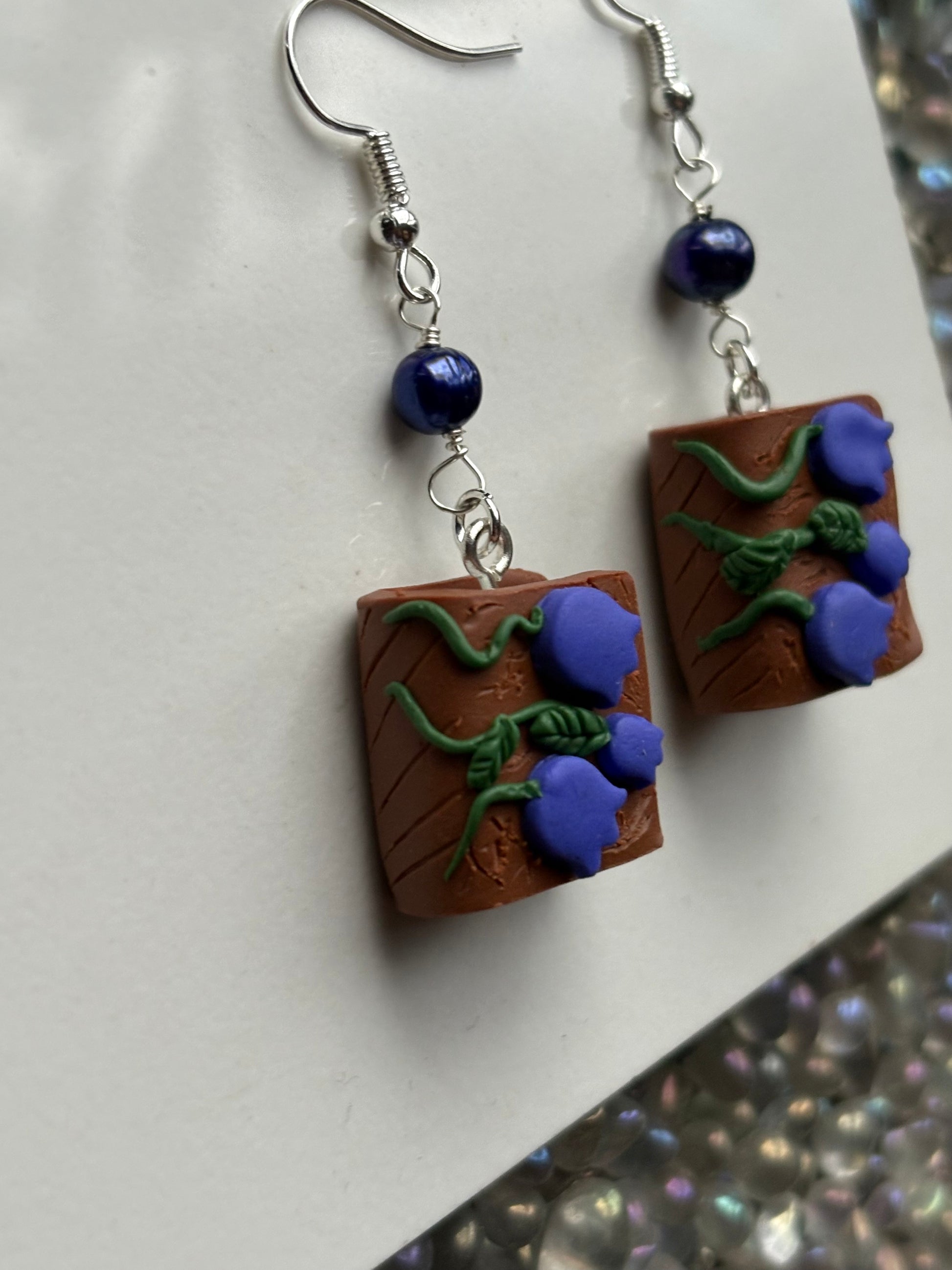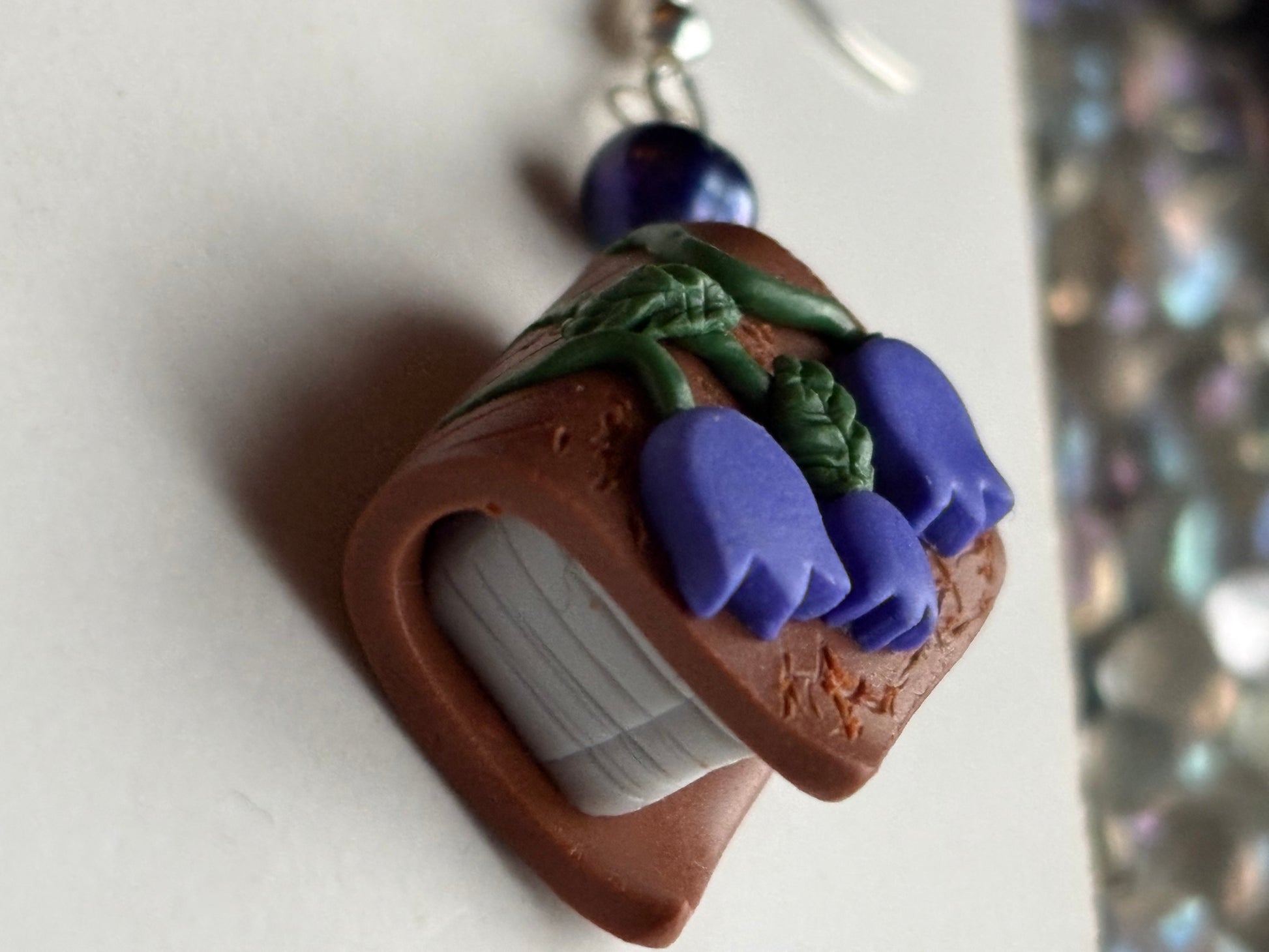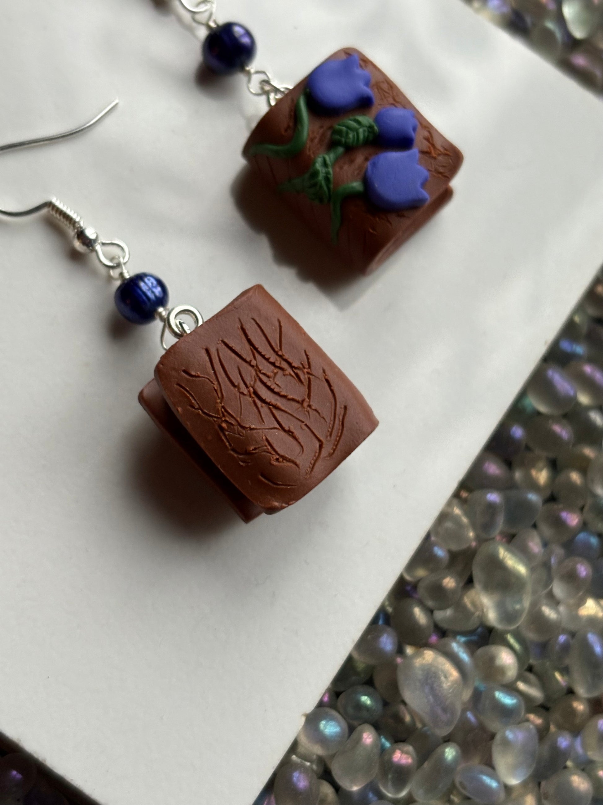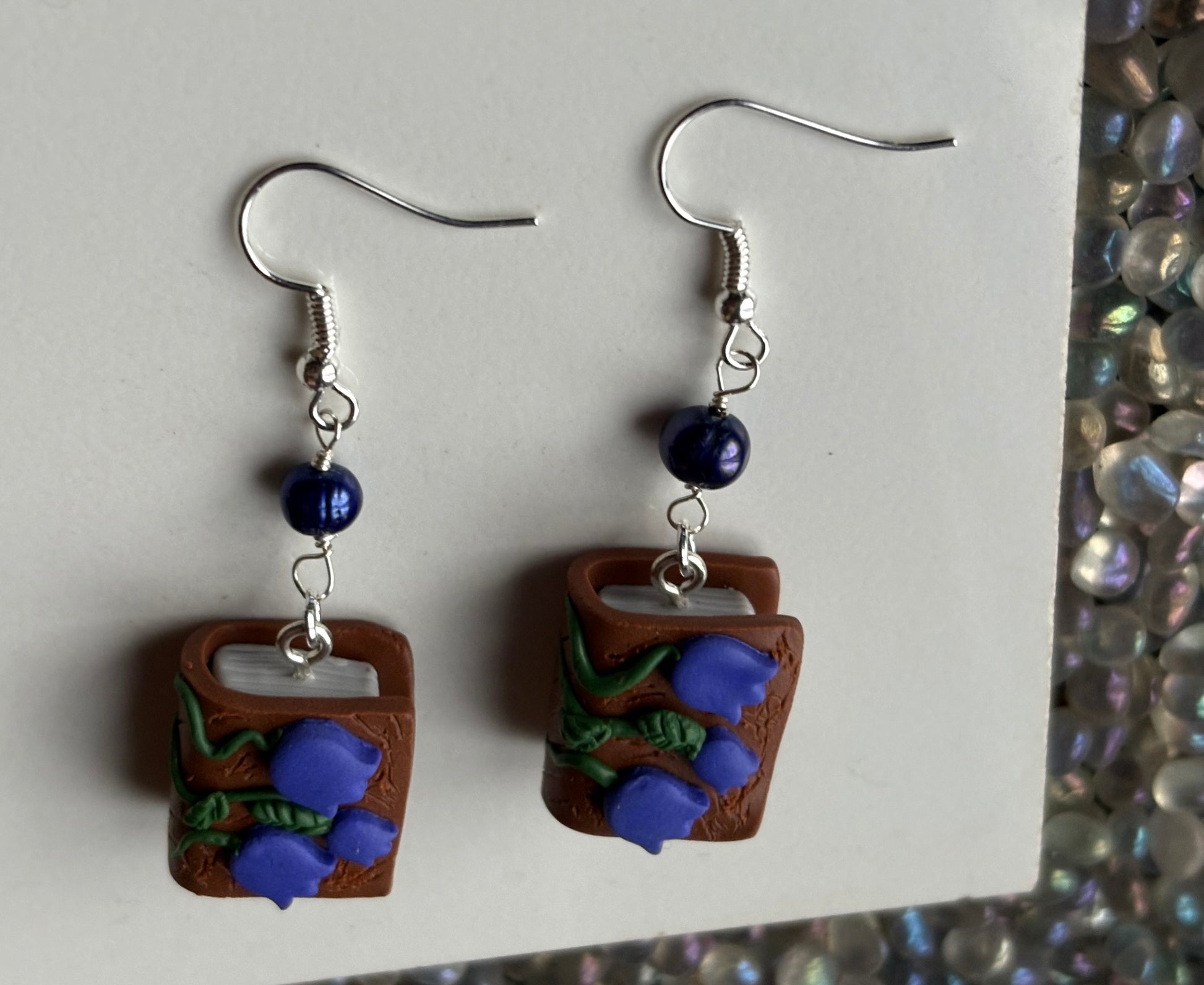 This particular design has a tiny book with a bluebell flower cover with matching coloured Purple Freshwater Cultured Pearl beads