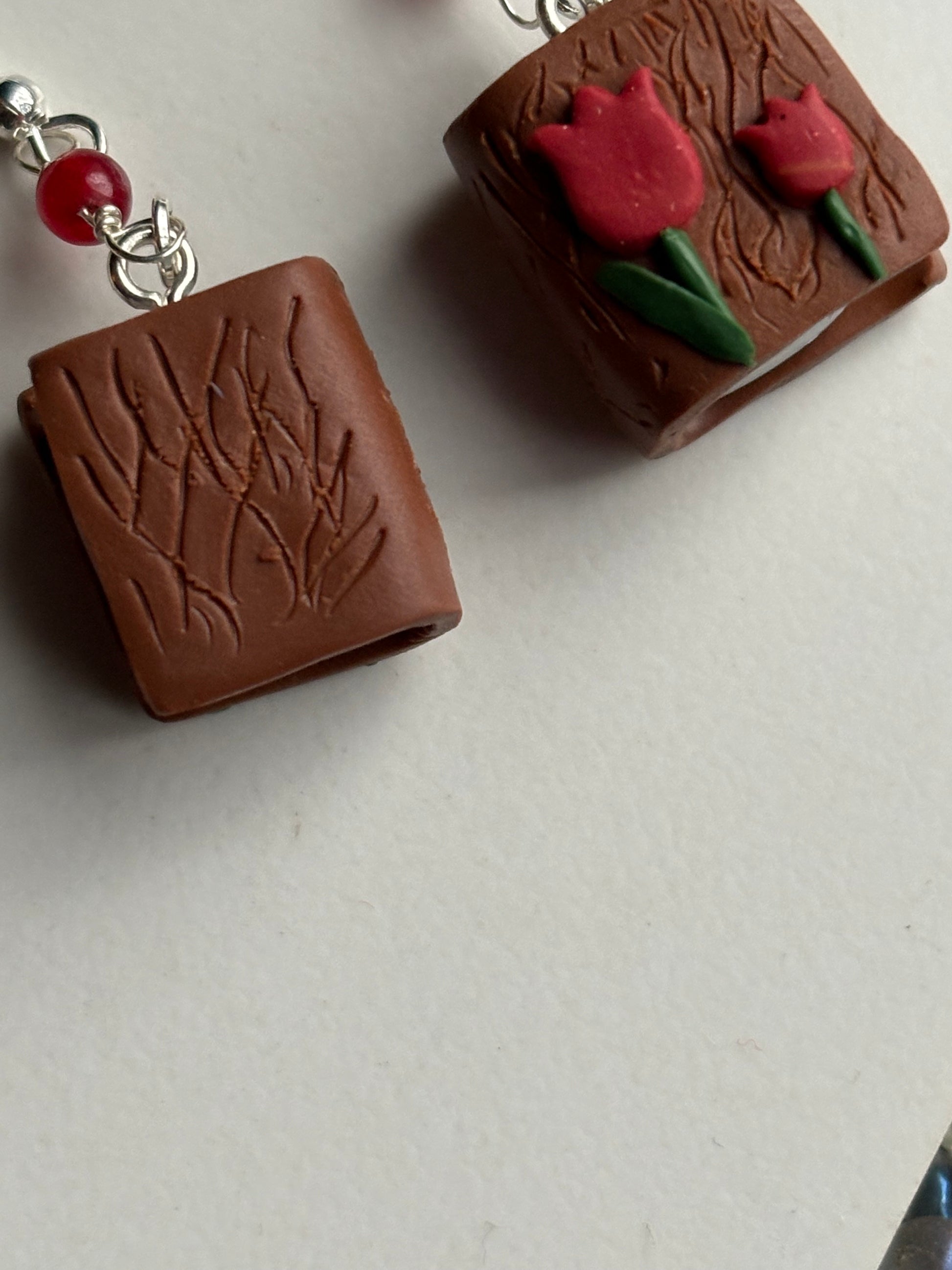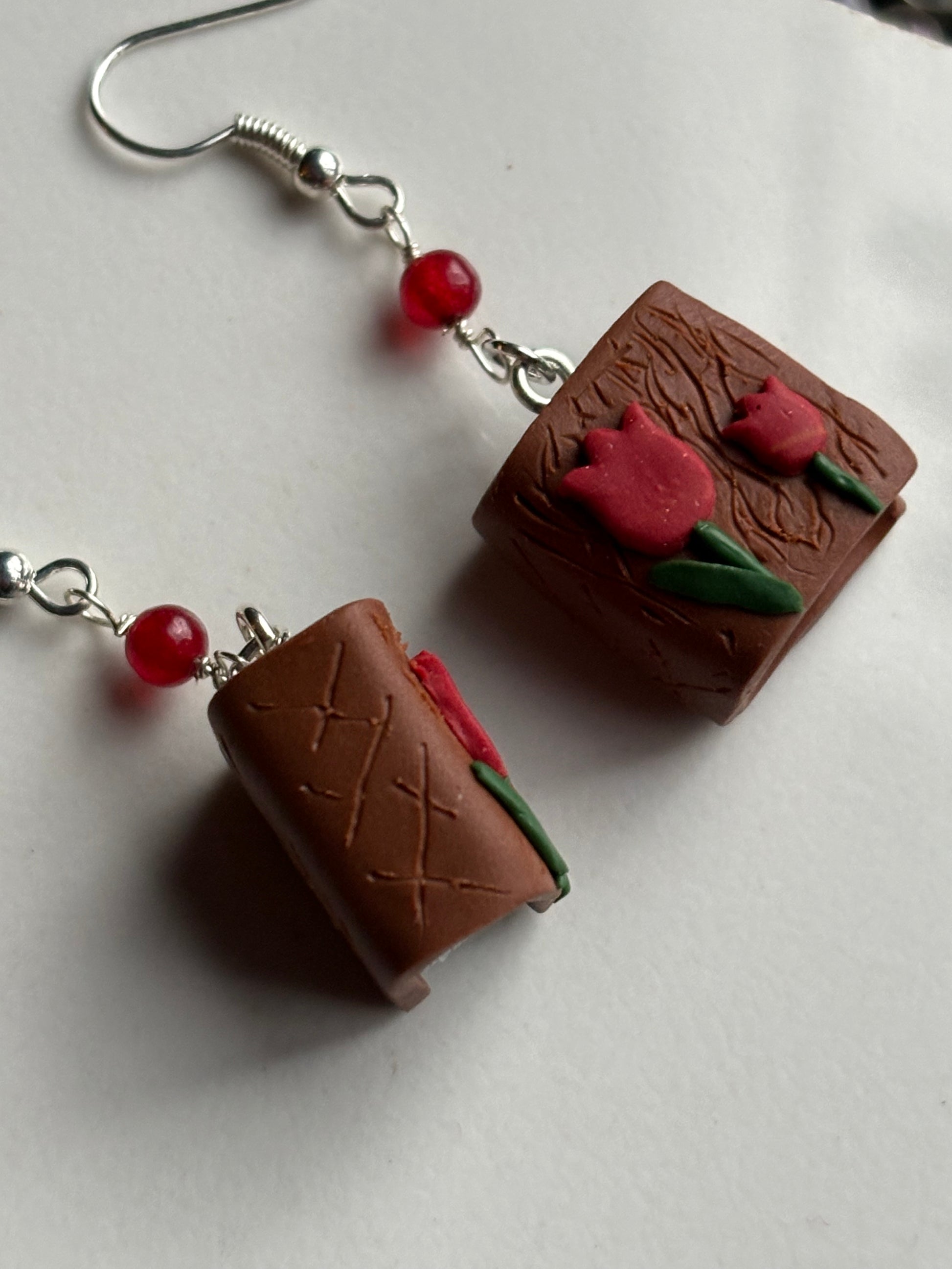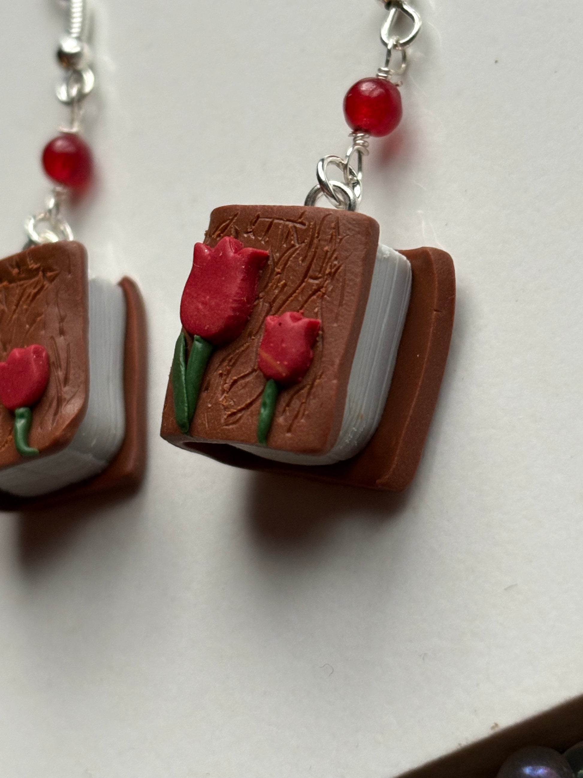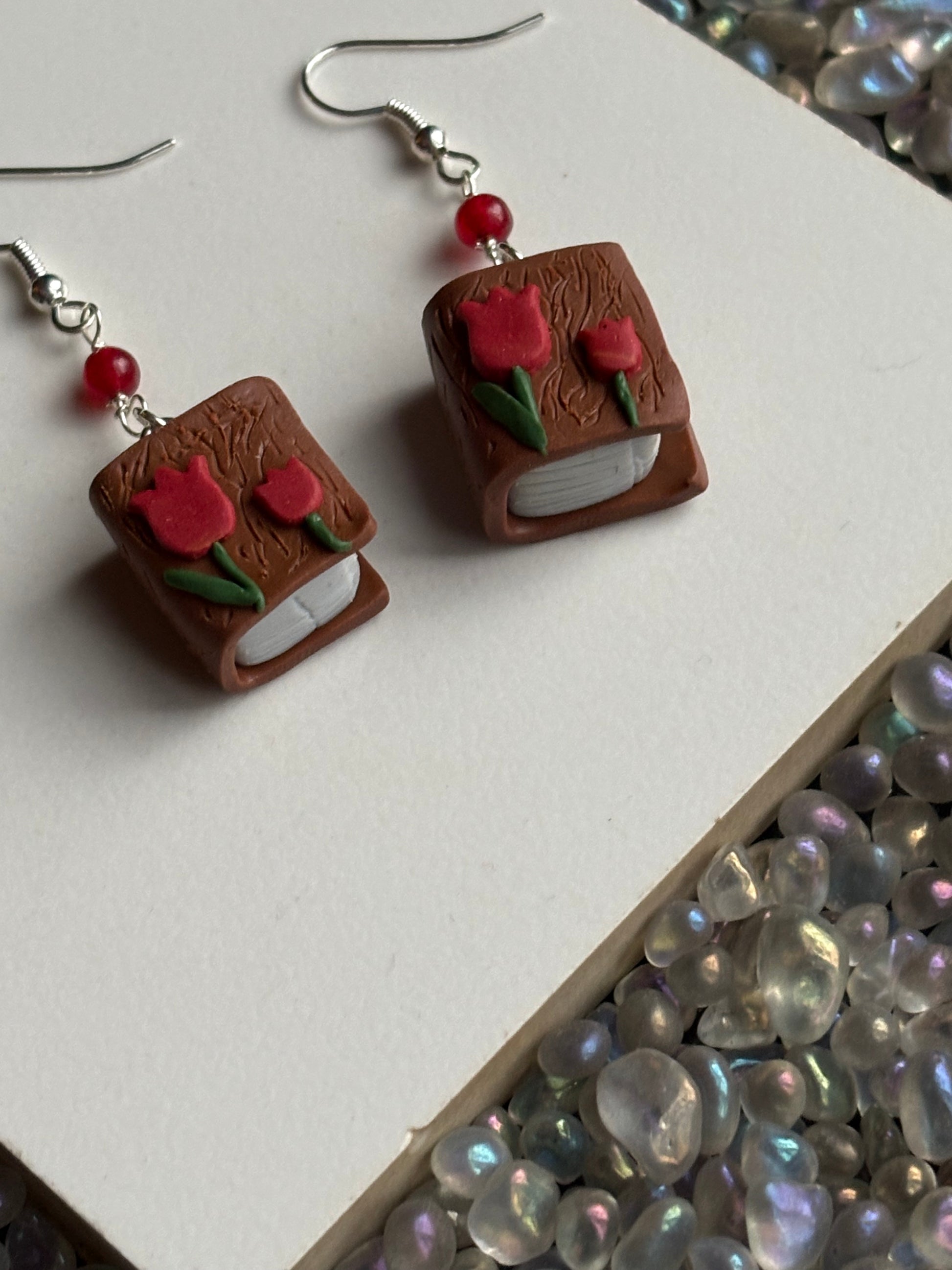 This particular design has a tiny book with a glittery Tulip flower cover with matching coloured red quartz beads