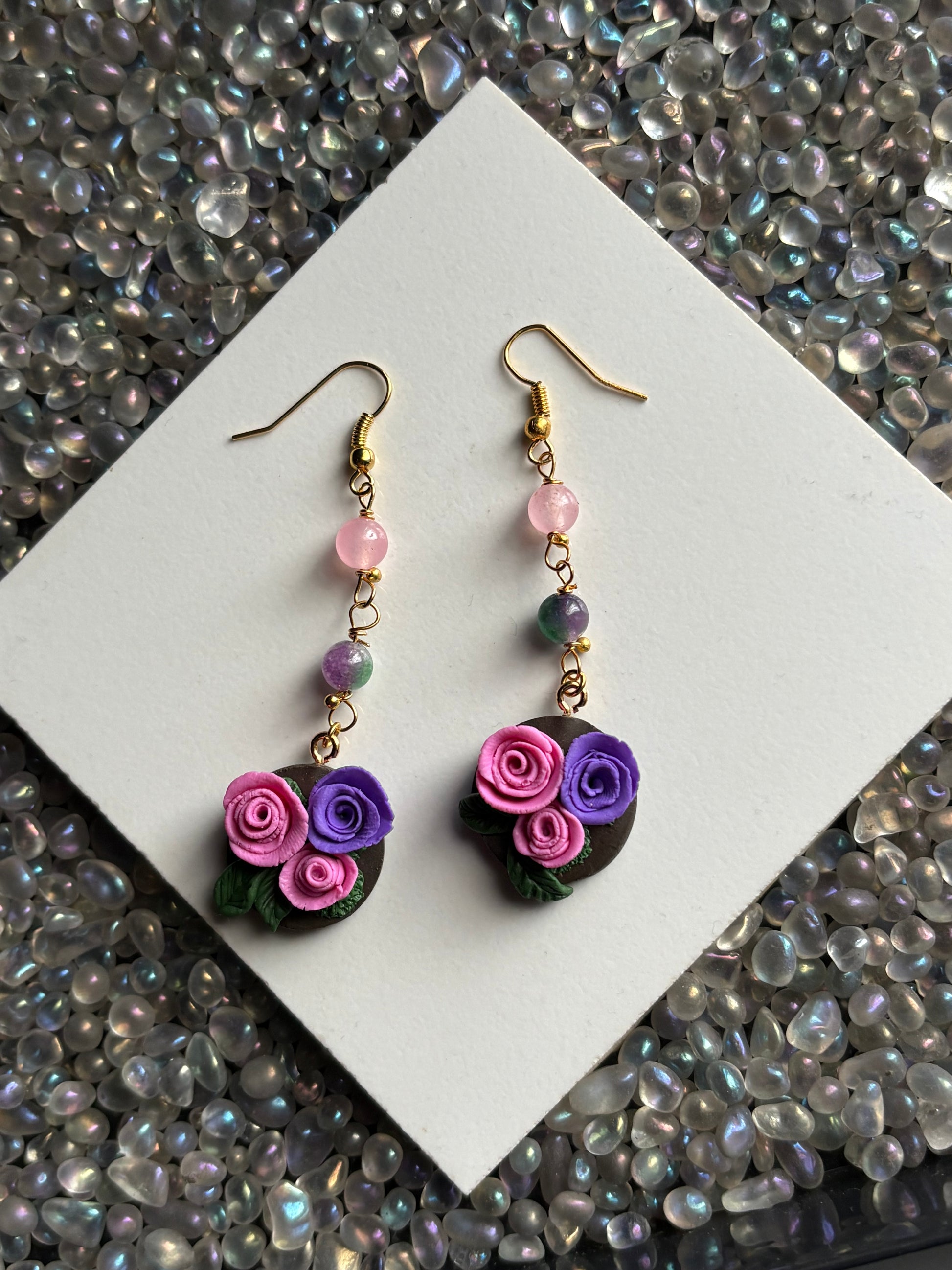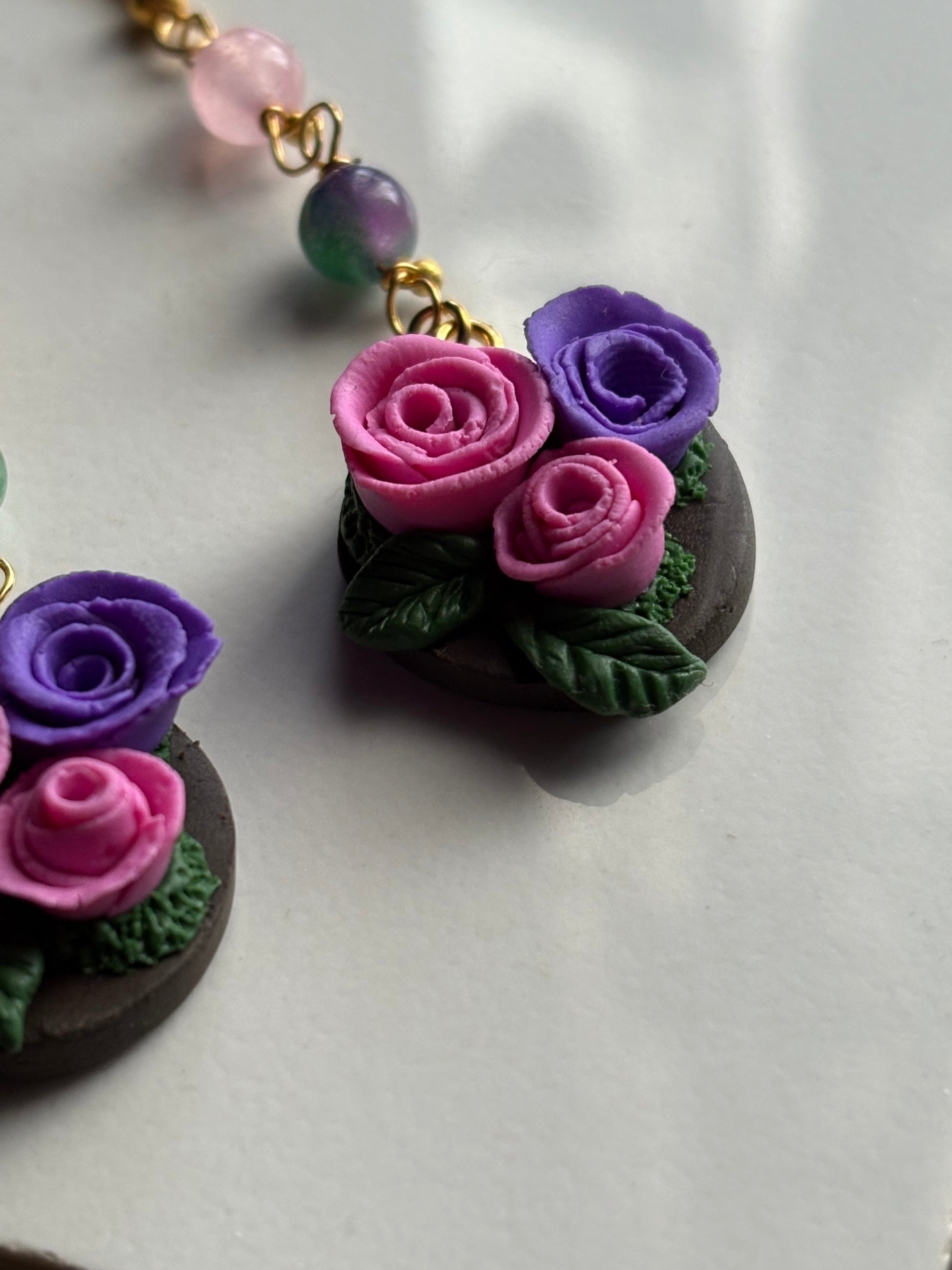 Inspired by the floral charm of Bridgerton on Netflix, reminiscent of the graceful styles worn by Posy. These handcrafted earrings feature intricate clay roses suspended from vintage-inspired beadwork. Lightweight yet eye-catching, they sway beautifully with every movement, making them perfect for garden parties, special occasions, or adding a touch of Regency romance to your everyday look.